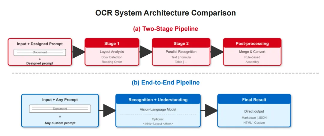 该机制解决了纯端到端OCR缺乏显式布局分析的痛点:流水线OCR可输出元素边界框、类型和阅读顺序,而传统端到端OCR直接生成结果,丢失了空间定位能力。