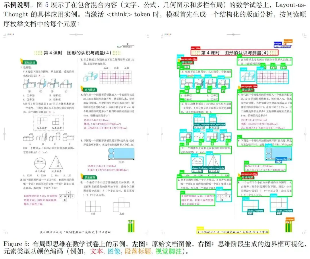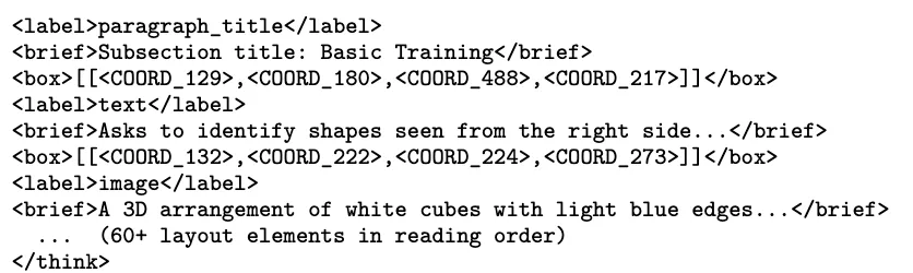 机制定义:通过⟨ think ⟩特殊token触发的可选思维阶段,模型在生成最终输出前,先生成结构化的布局表示(边界框、元素类型、阅读顺序),将布局分析转化为模型的“中间推理步骤”,而非独立的前置任务。