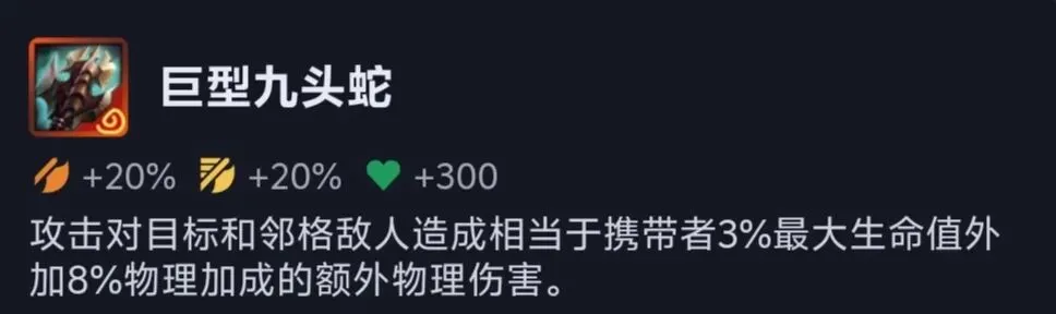 神器巨型九头蛇神器属性对目标和邻格敌人造成携带者3%最大生命值外加8%物理加成伤害。面板提供了攻速、攻击、生命值,不要小看这3%哦,下图我给你分析完以后你就懂了什么叫惊喜。