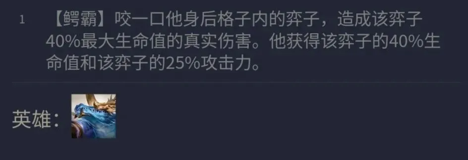 雷克顿的被动可以咬一口身边敌人获得他40%的生命值和25%的攻击力。新春使者选择斗士羁绊,8斗提供了1300生命值,再算上自身的生命值和吞噬效果。裸装备的鳄鱼都快突破3000的血了,搭配巨型九头蛇,每一下平A都能稳定多打近300点AOE伤害。装备拉满后,鳄鱼进场转一圈,直接清场结束对局!