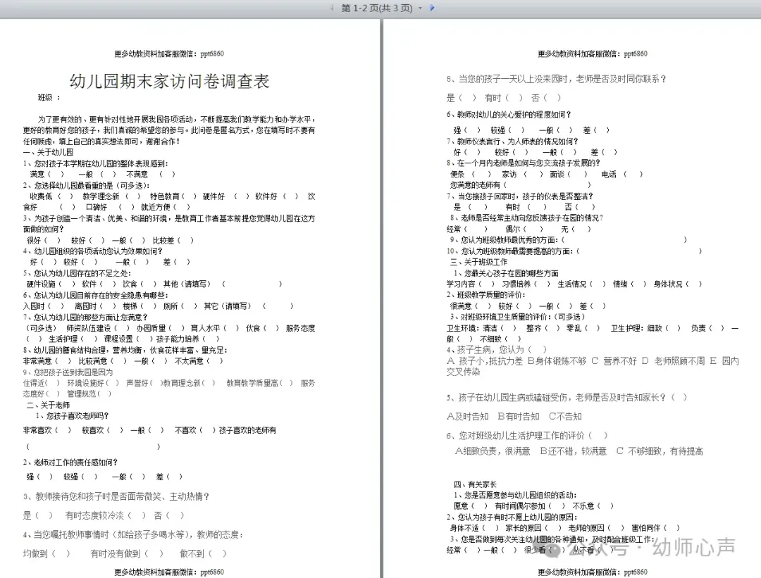 幼儿园期末家访问卷调查表