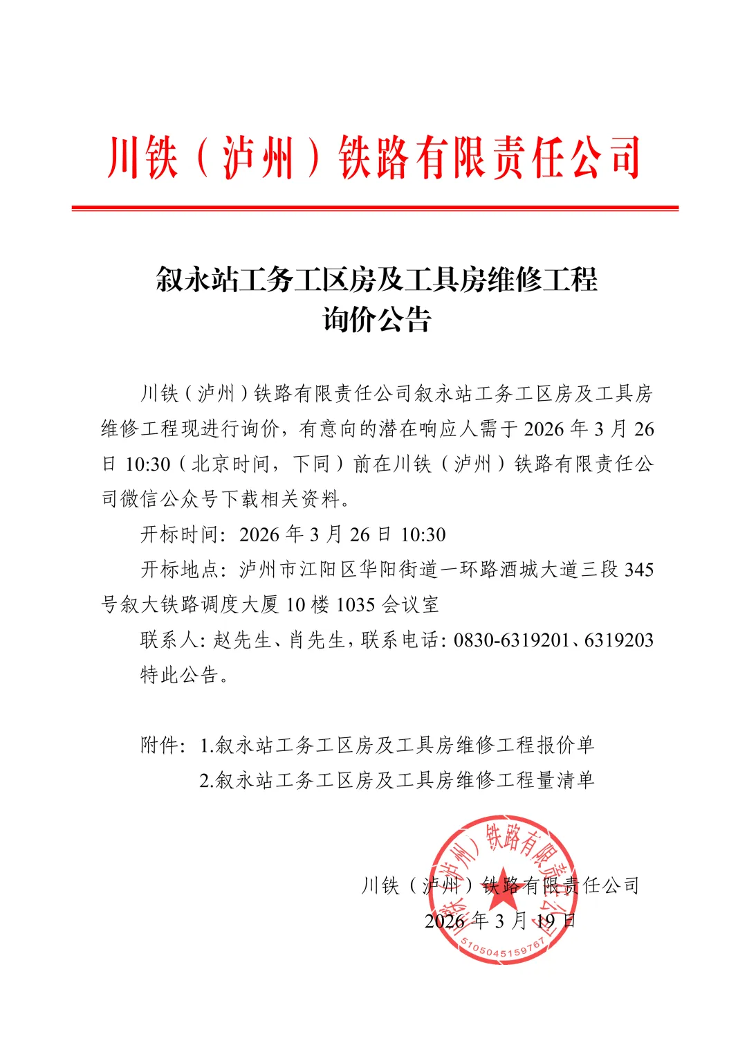 叙永站工务工区房及工具房维修工程询价公告 附件: 附件1:叙永站工务工区房及工具房维修工程报价单.docx 附件2:叙永站工务工区房及工具房维修工程量清单.xlsx 供稿丨工程资产管理小组 编辑丨党群工作部 转载或引用请联系授权