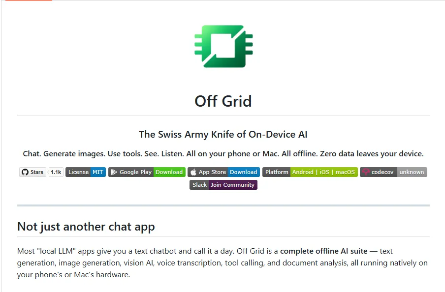 说白了,Off Grid 就是一把”离线 AI 瑞士军刀”。