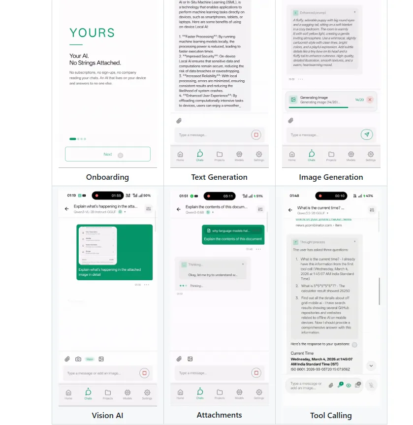 于是他用 React Native 搭了个框架,把 llama.cpp(跑大模型的)、Stable Diffusion(画图的)、Whisper(语音识别的)全塞进了一个手机 App 里。