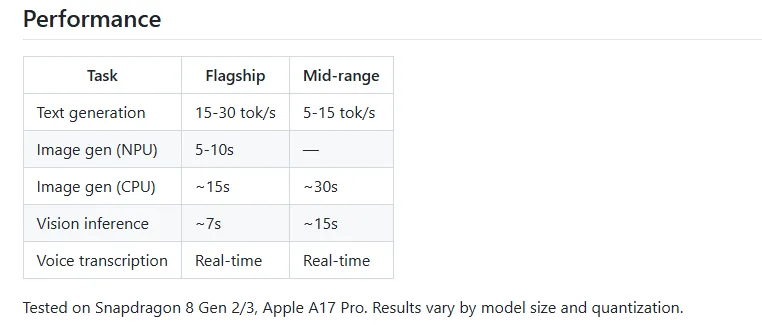 根据 README 的 benchmark:旗舰机约 7 秒,中端机约 15 秒。可以分析文档、描述场景、读取收据。