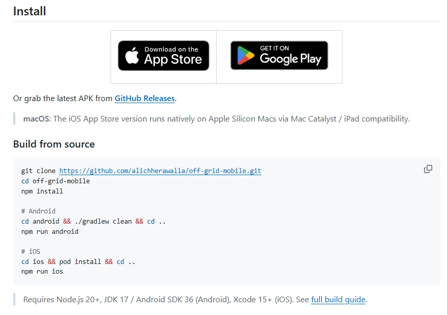 安卓用户:直接去 Google Play 搜 “Off Grid”,或者去 GitHub Releases 下 APK