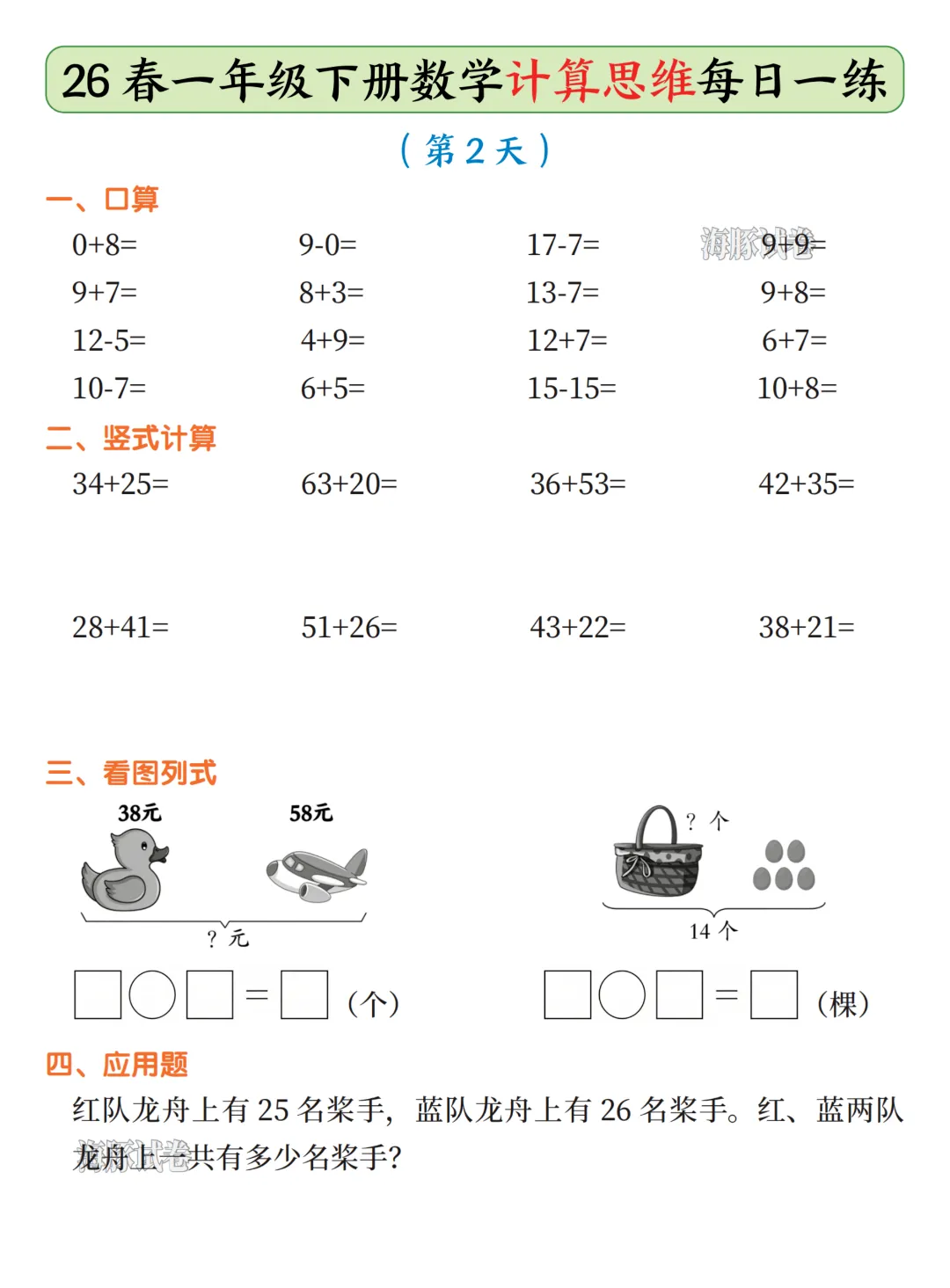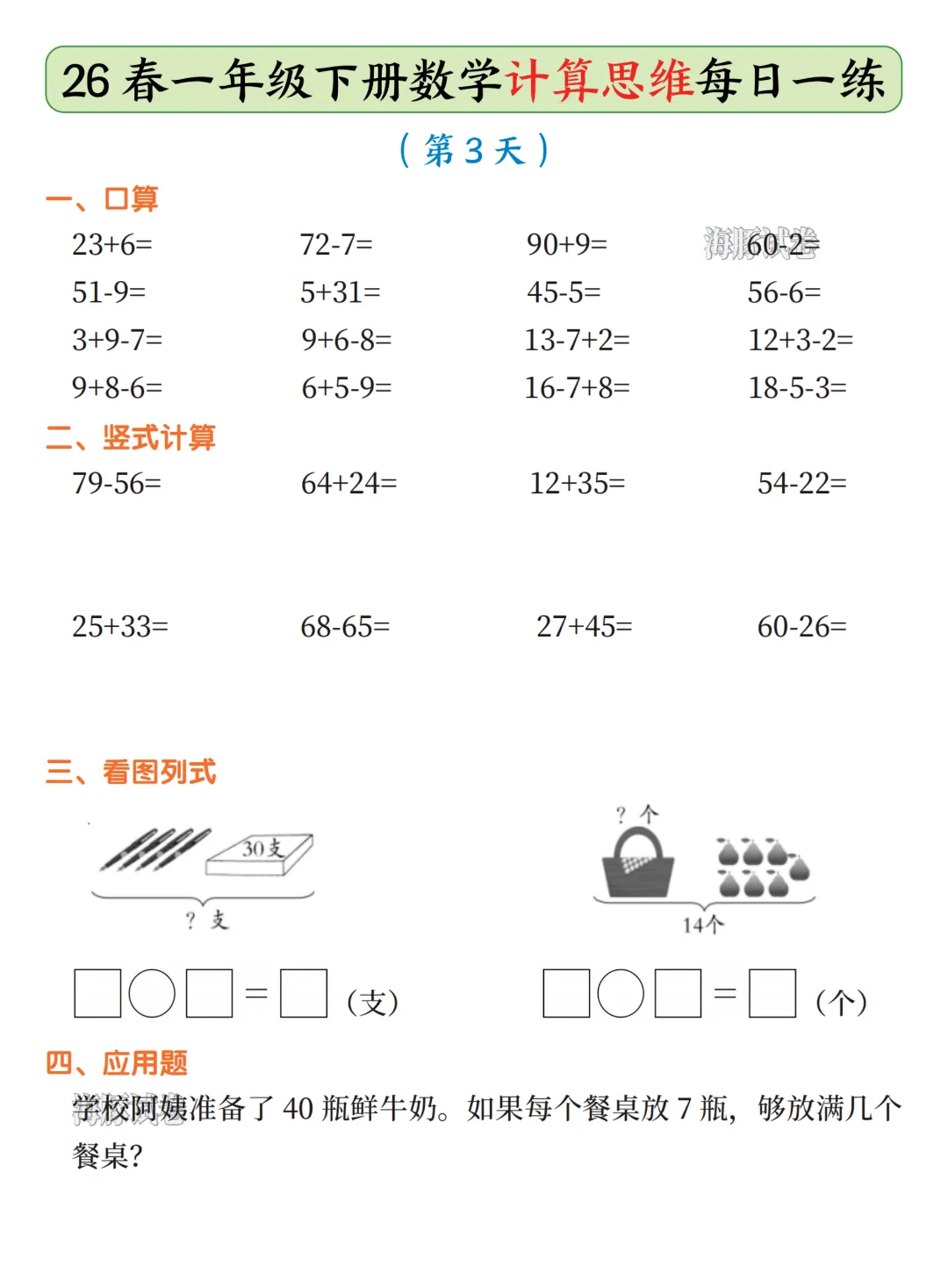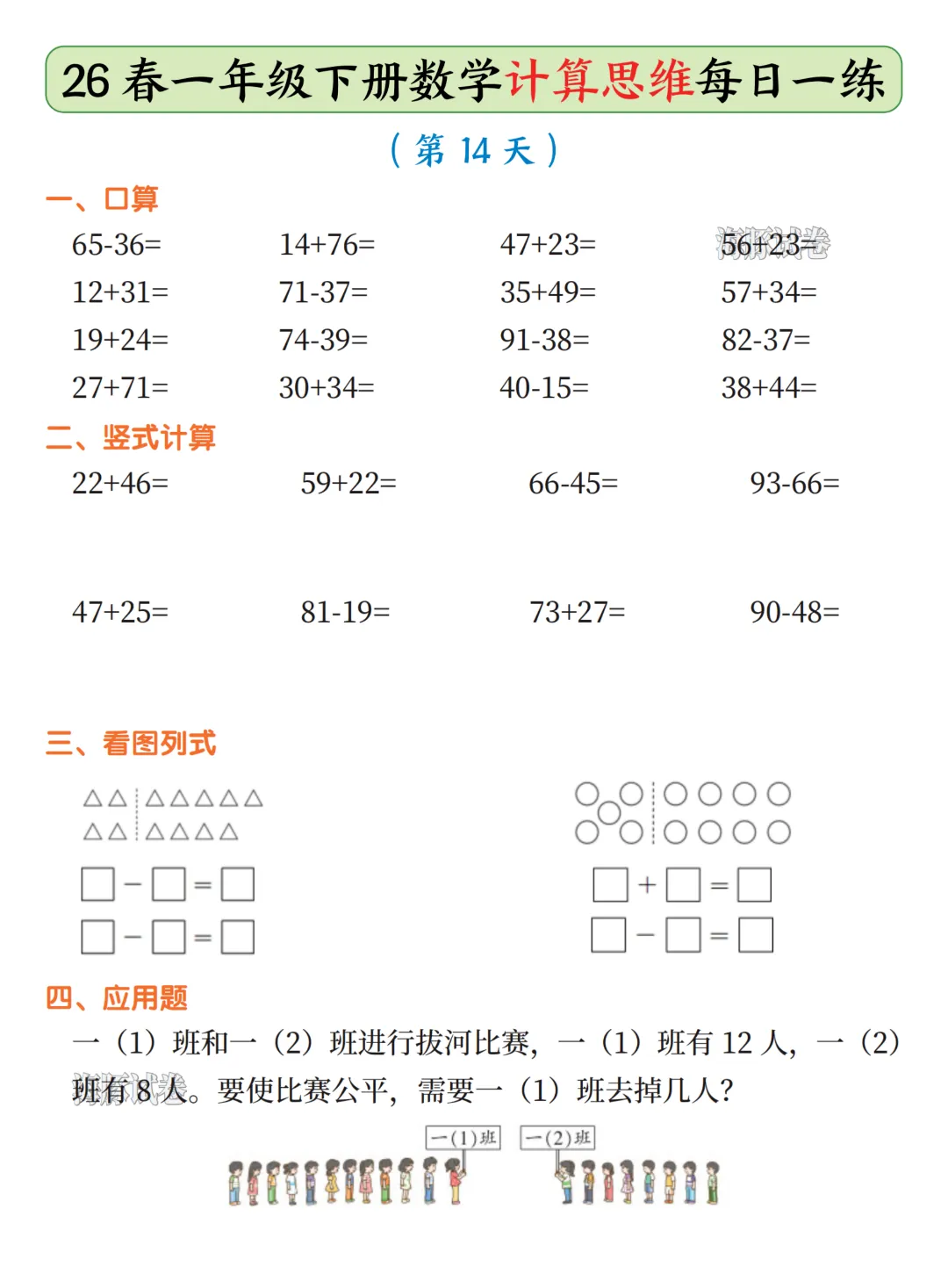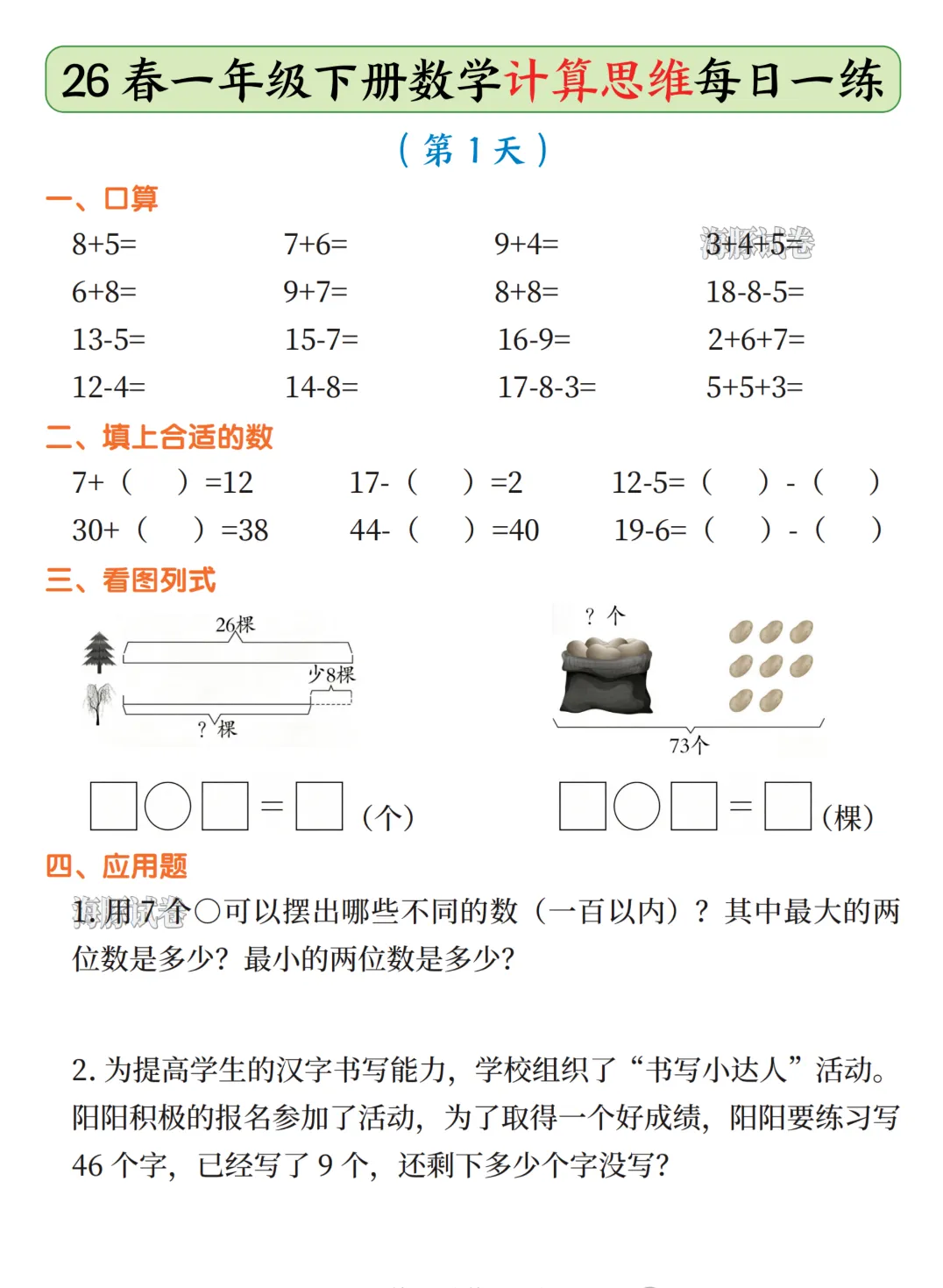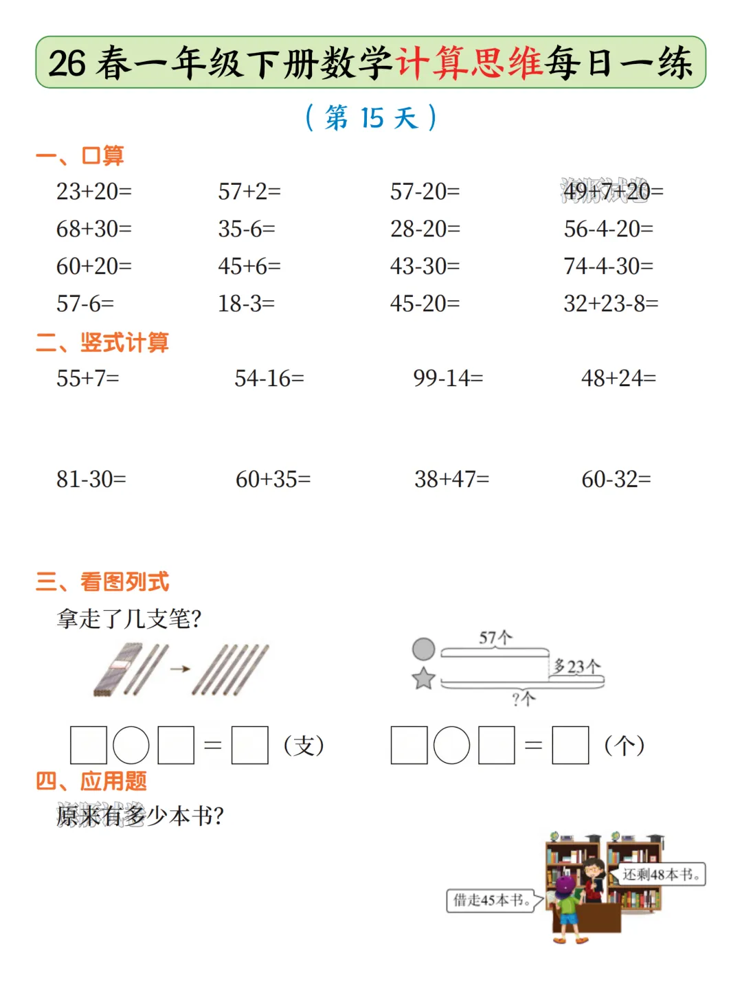 26年新版一年级下册数学(计算思维每日一练),共15页,电子版可下载,这份一下数学综合练习题,涵盖了口算、竖式计算、看图列式、应用题等题型,每天练一练,帮助孩子提升数学计算水平和逻辑思维能力,为一年级的数学学习奠定基础。需要的家长抓紧打印出来,让孩子练一练吧!