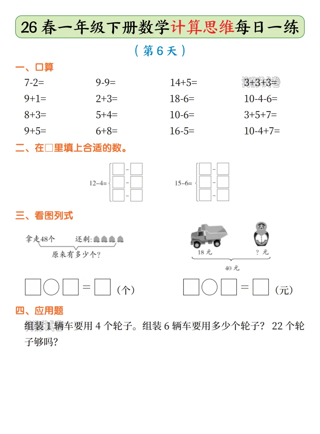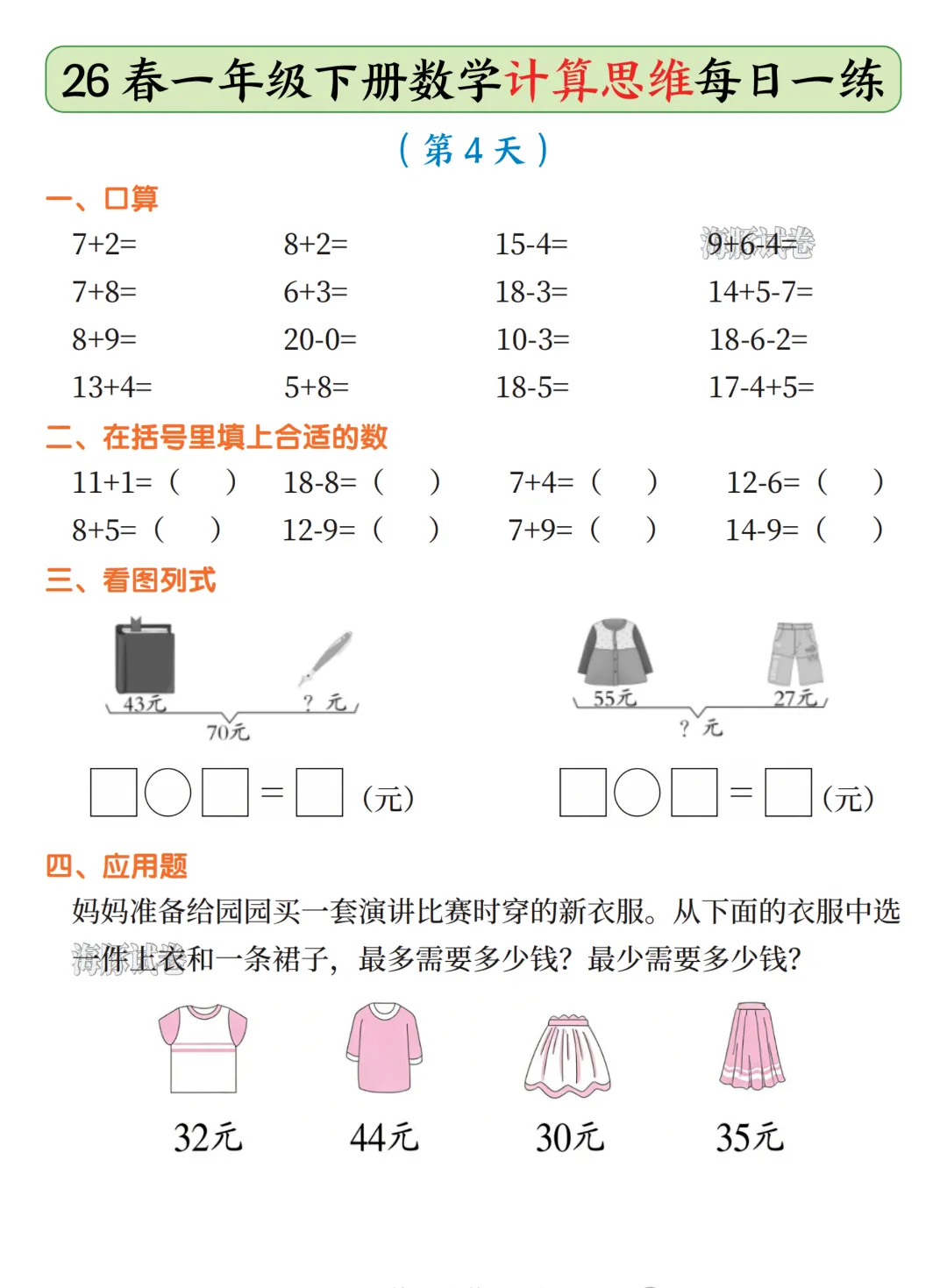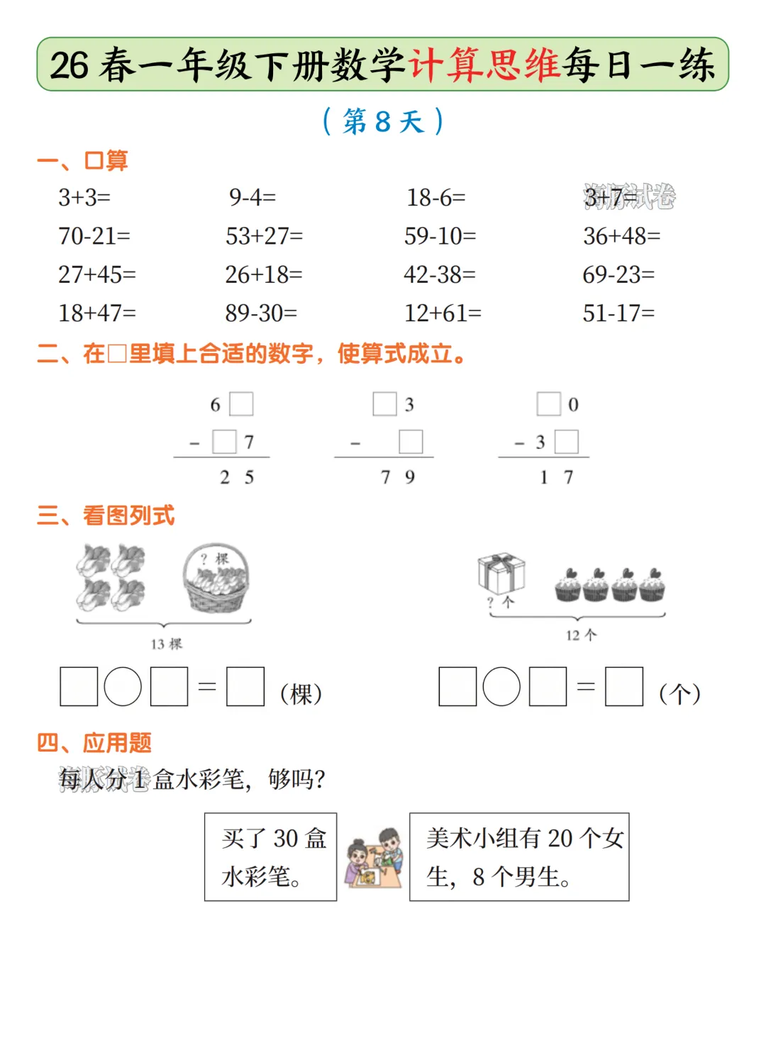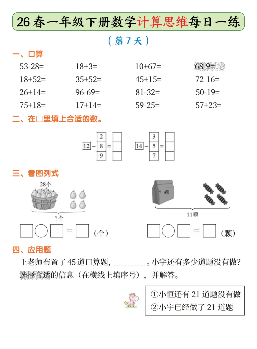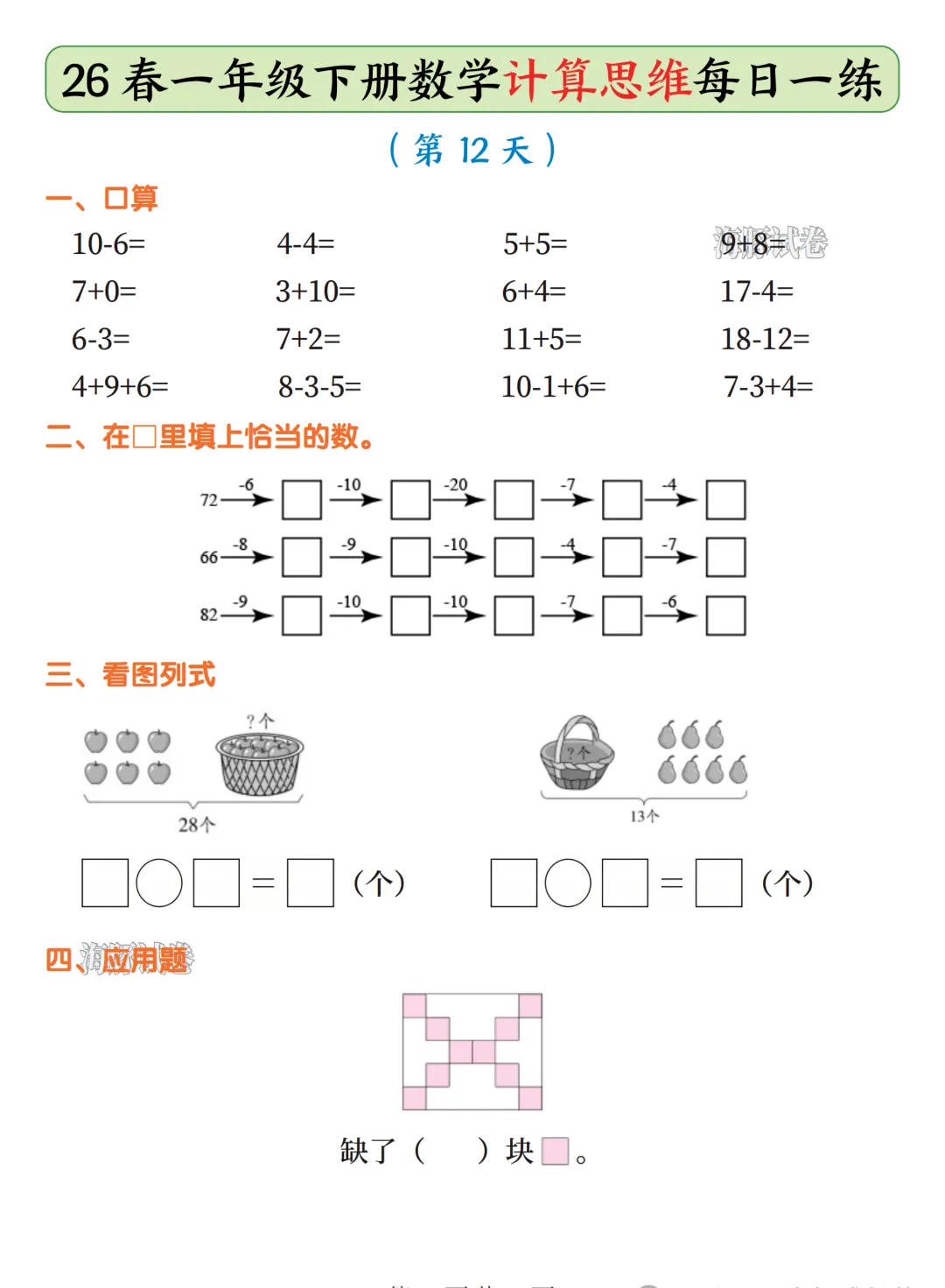 26年新版一年级下册数学(计算思维每日一练),共15页,电子版可下载,这份一下数学综合练习题,涵盖了口算、竖式计算、看图列式、应用题等题型,每天练一练,帮助孩子提升数学计算水平和逻辑思维能力,为一年级的数学学习奠定基础。需要的家长抓紧打印出来,让孩子练一练吧!