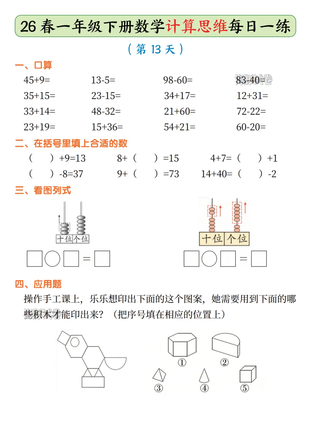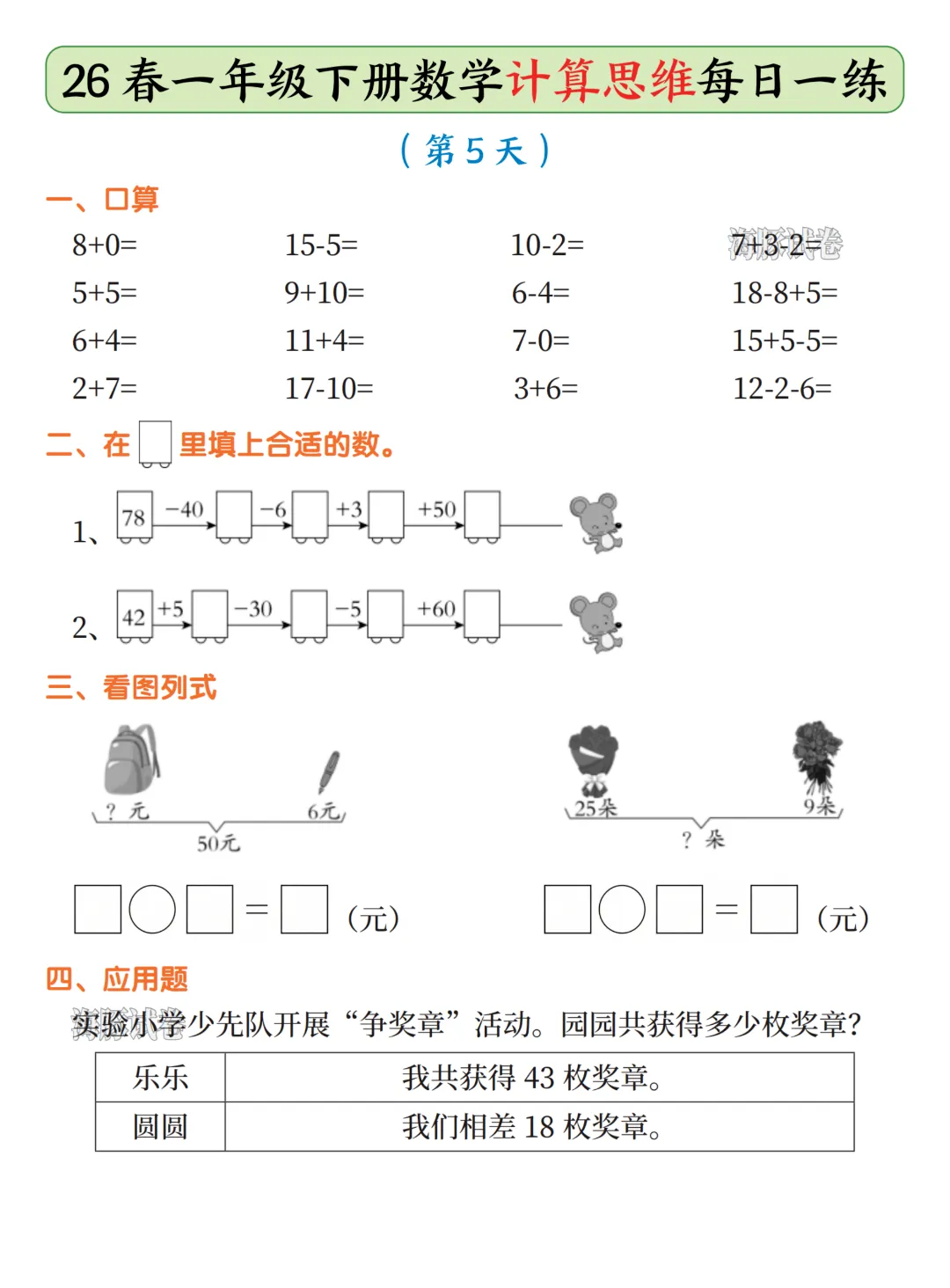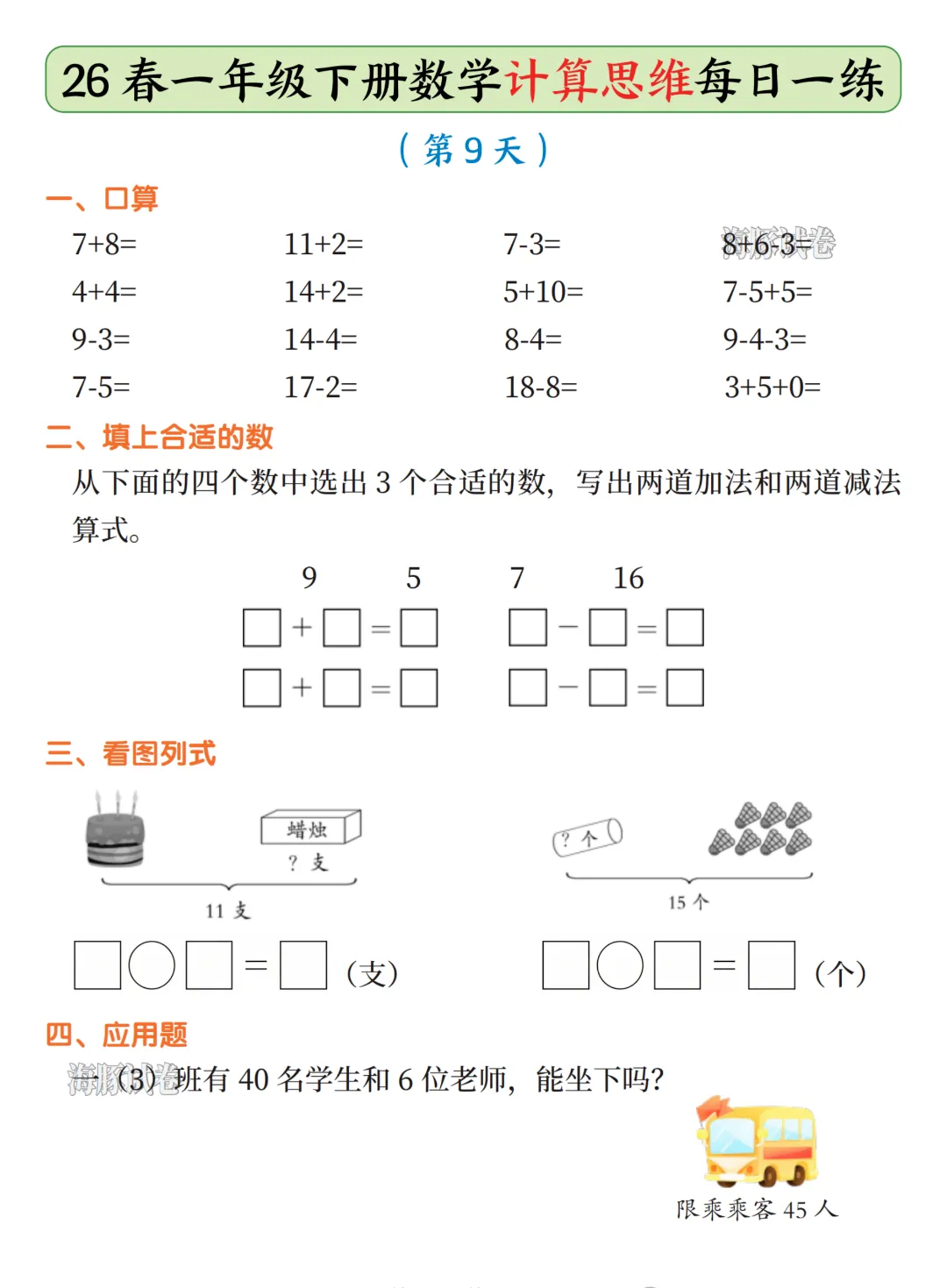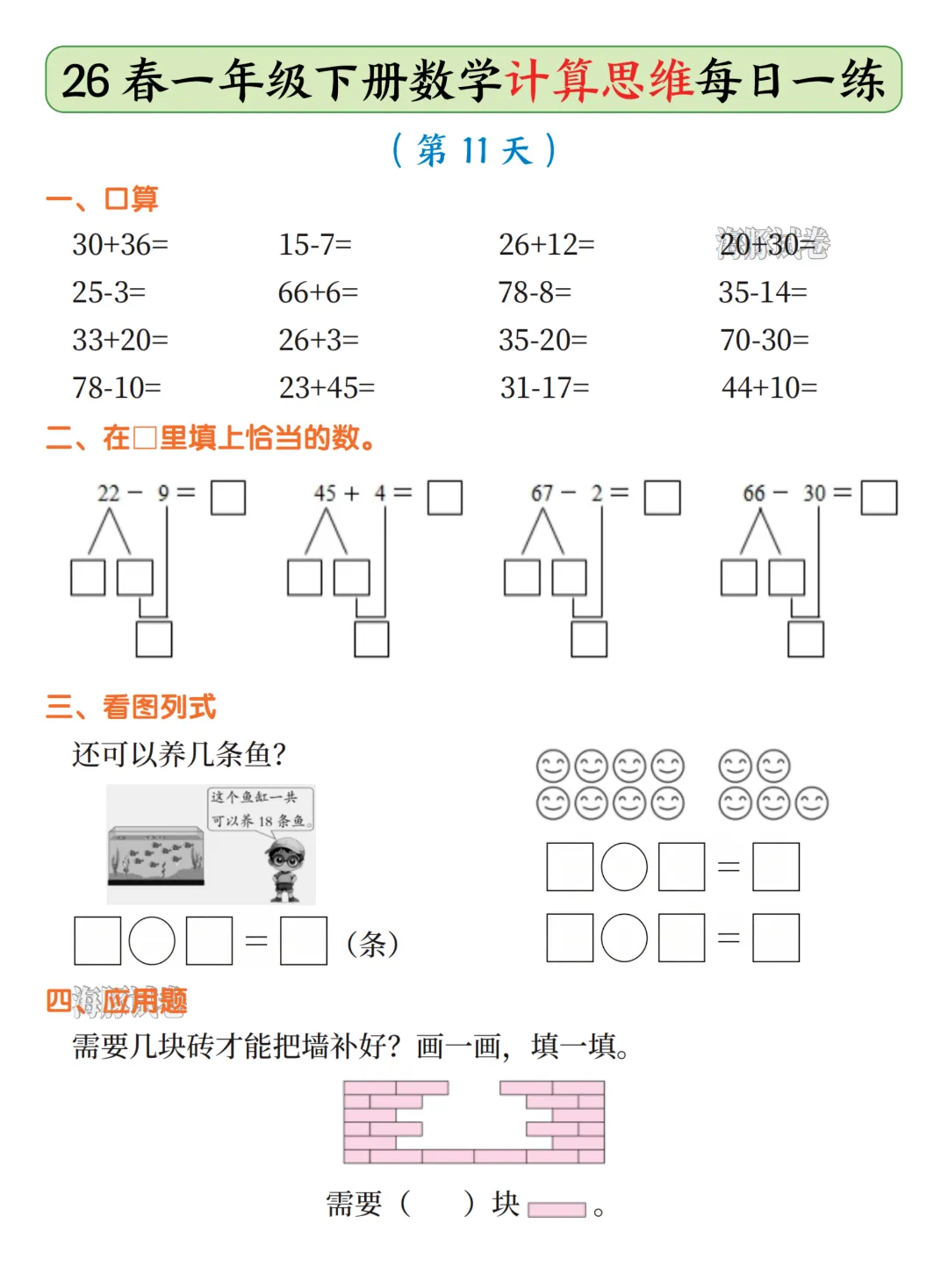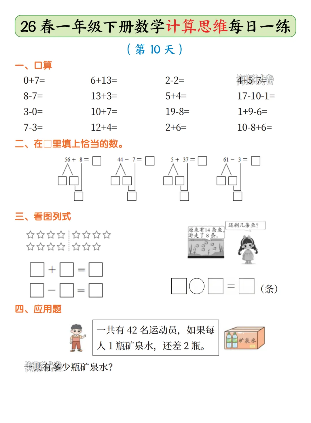 26年新版一年级下册数学(计算思维每日一练),共15页,电子版可下载,这份一下数学综合练习题,涵盖了口算、竖式计算、看图列式、应用题等题型,每天练一练,帮助孩子提升数学计算水平和逻辑思维能力,为一年级的数学学习奠定基础。需要的家长抓紧打印出来,让孩子练一练吧!