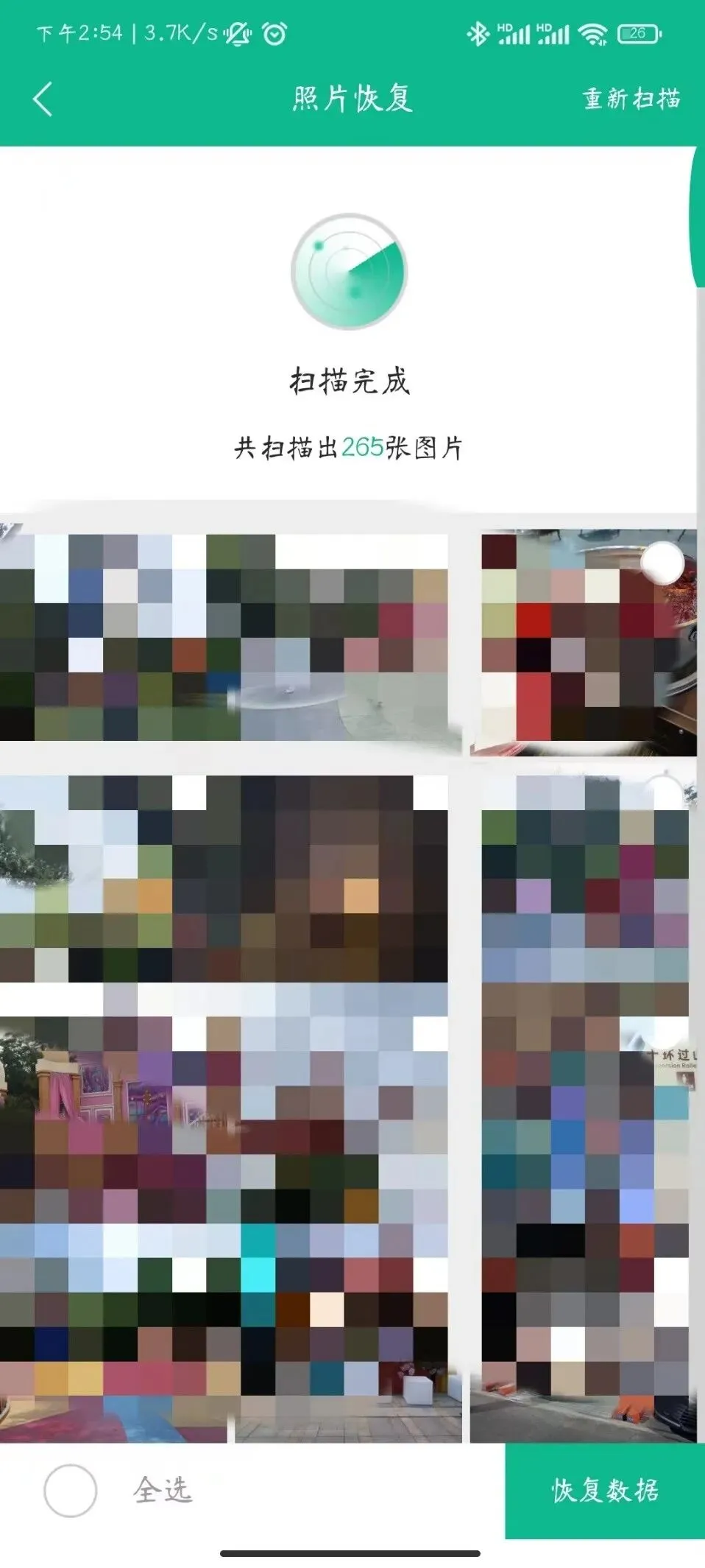 尝试了一下照片恢复功能,惊喜地发现它可以扫描出已经删除的照片,无疑是非常强大的。虽然看起来只有265张照片,但原因是是刚换了新手机。