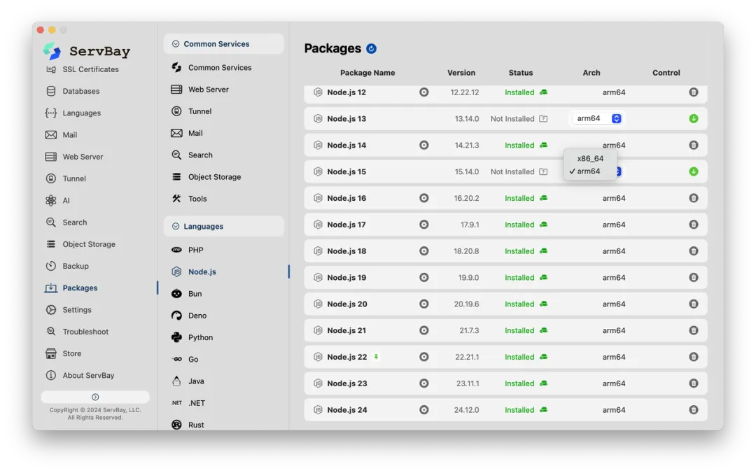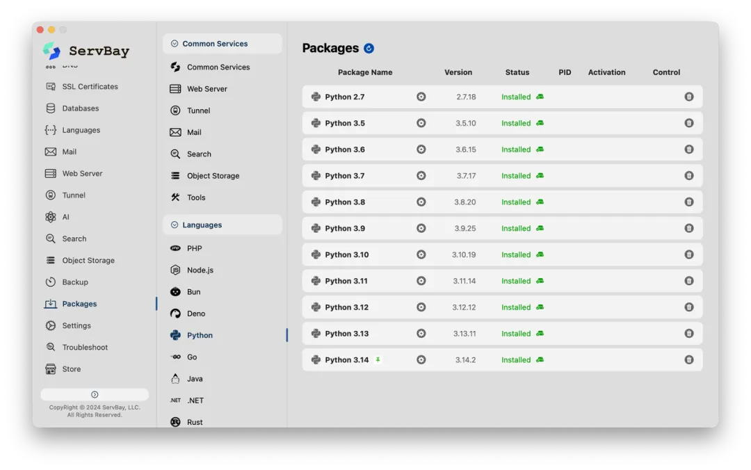 Python、Node.js 这种基础环境,在 ServBay 里都是一键安装。根本不需要去研究环境变量怎么配,也不需要担心版本冲突。你想跑哪个 AI 工具,环境就在那里,不离不弃。