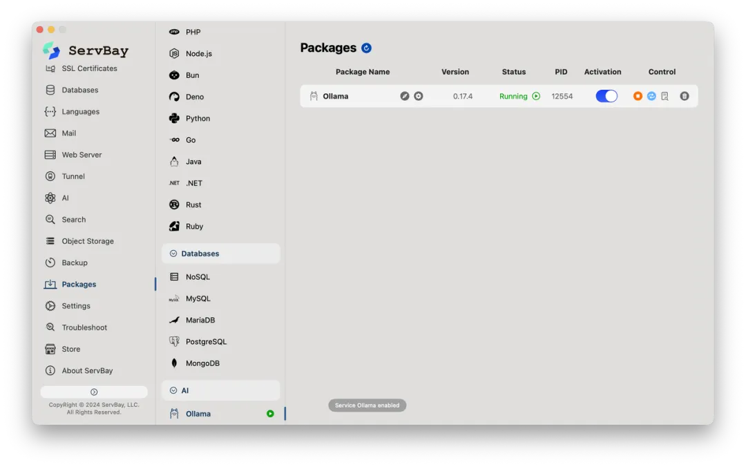 如果觉得线上 API 贵,还可以在本地跑大模型。ServBay 还能支持一键安装 Ollama,断网也能跑,隐私保得住,速度快到飞起。