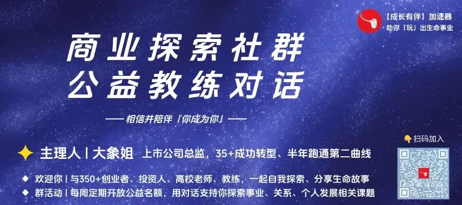 我发起了一个公益对话群,主要活动是通过教练对话支持群友们探索事业、家庭、关系、个人发展方面的课题(一季度定期开放免费对话名额)。