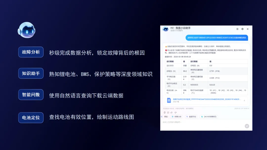 长期以来,锂电池运维高度依赖专家经验。面对“电压低锁定”“压差大保护”等故障表象,技术人员往往需手动调取数千行数据、绘制曲线,费时费力才能定位根因,且存在漏判、误判风险。