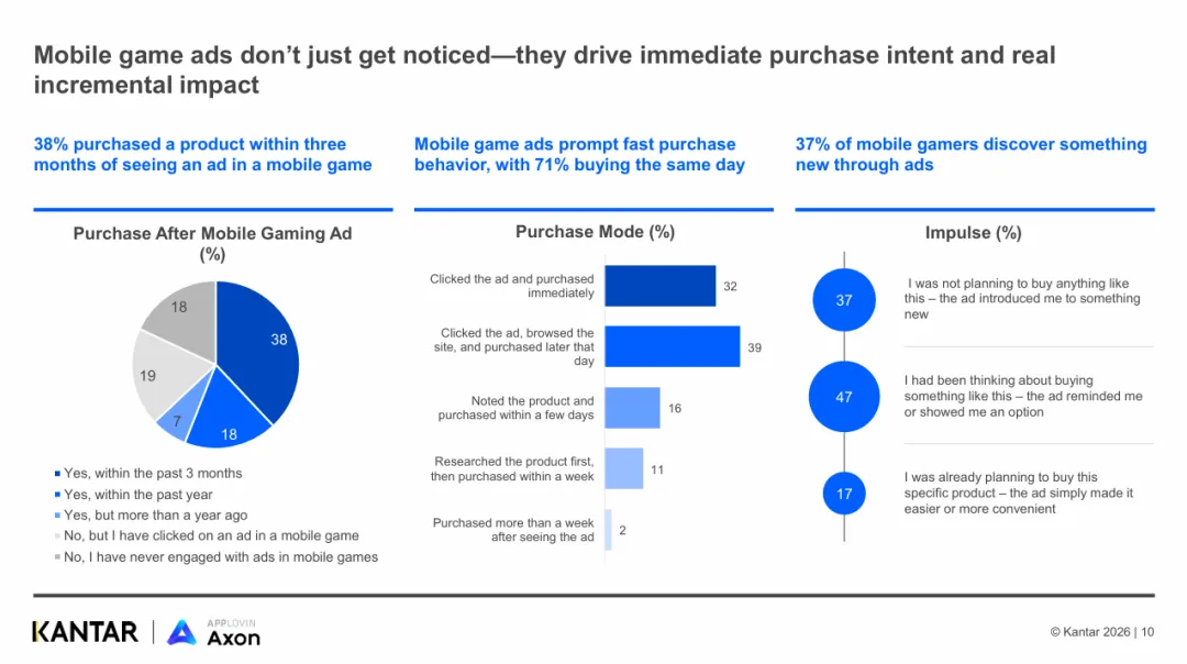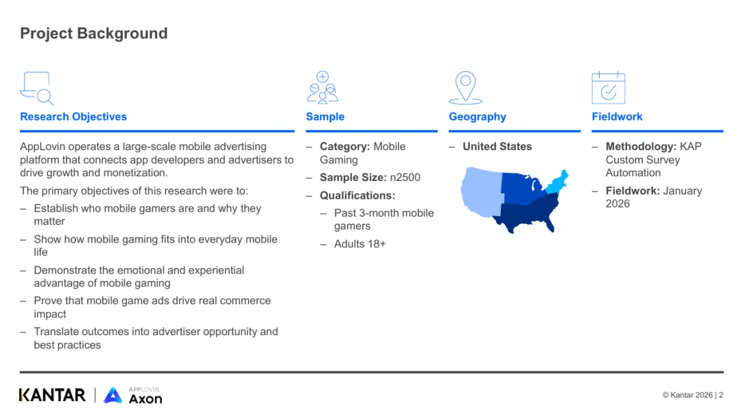 AppLovin与Kantar联合发布的《移动游戏:新的主流消费渠道》研究报告,基于2026年1月对美国移动游戏用户的深度调研,揭示了一系列值得关注的数据。