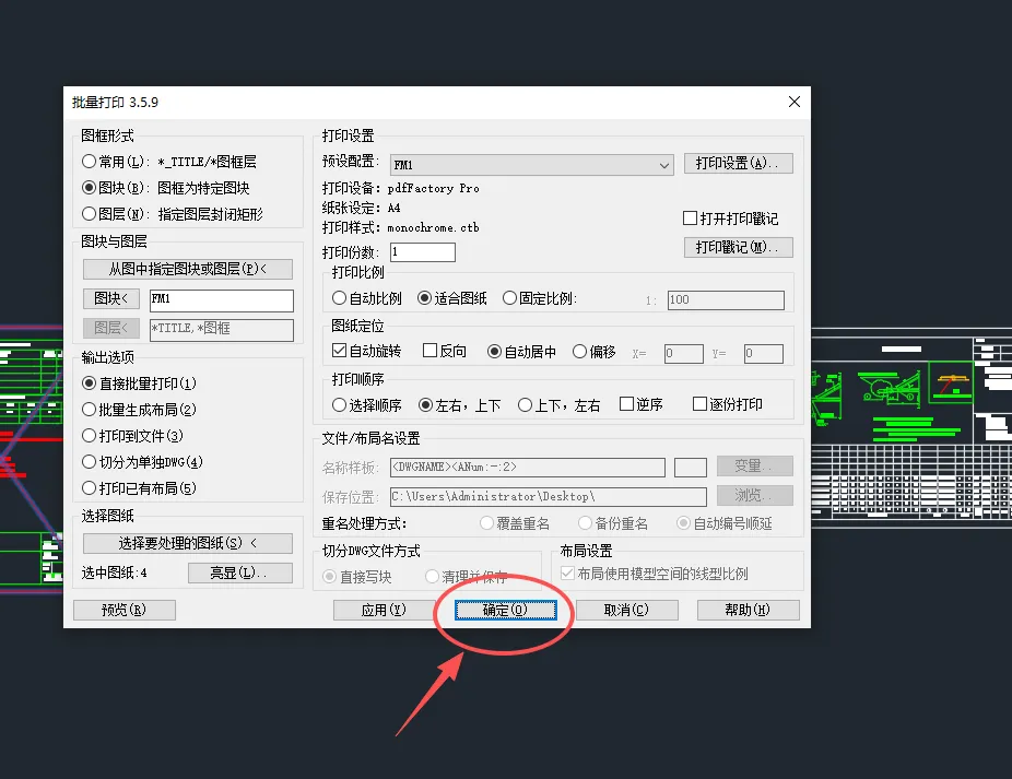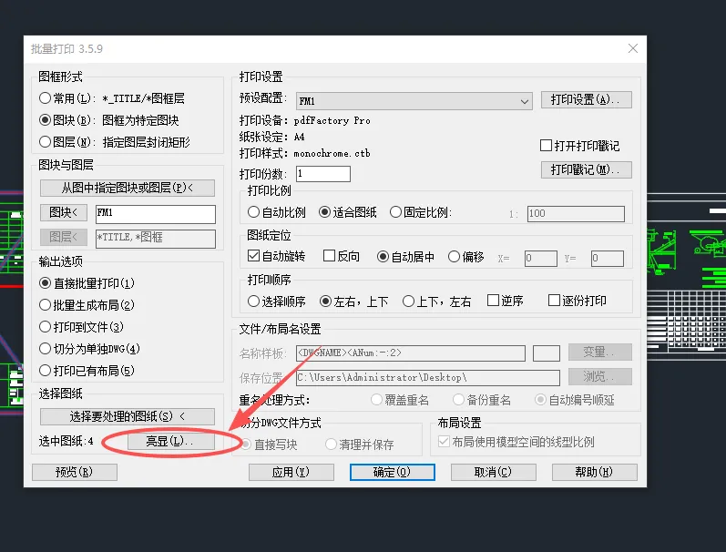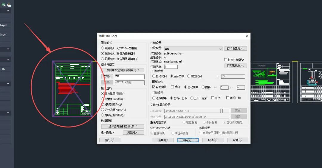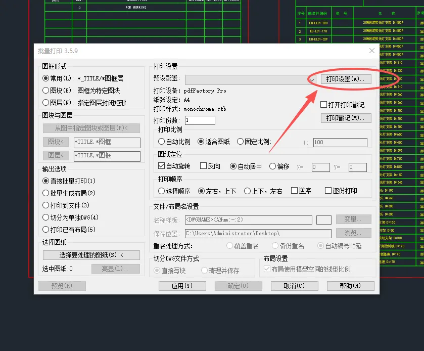 点击回车后,会跳出批量打印插件的窗口,此时我们点击打印设置,设置打印的需求,例如设置一个A4的打印,或者是A3,A1等等,我们这里是用的A4,制作图一般都是用A4纸张进行打印的。