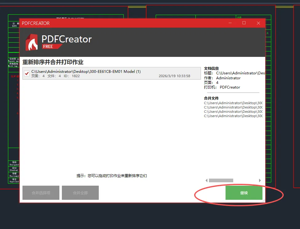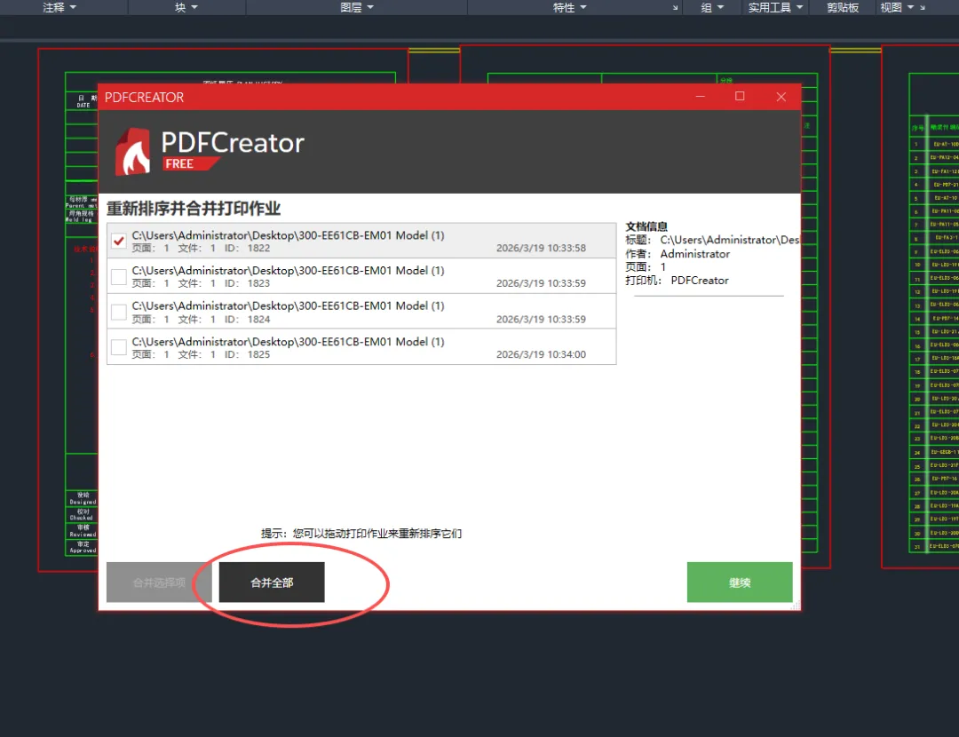 打印完成会跳出窗口,这个咱们之前设置好的打印,要用这个软件点击合并