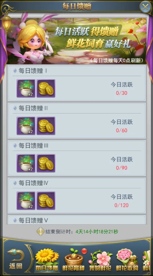 活动期间,将开启每日馈赠、鲜花育种、我的鲜花、鲜花收购、鲜花图鉴、鲜花好礼、育种补给活动内容。