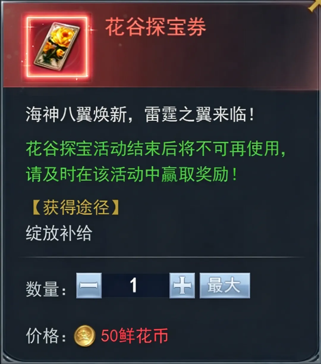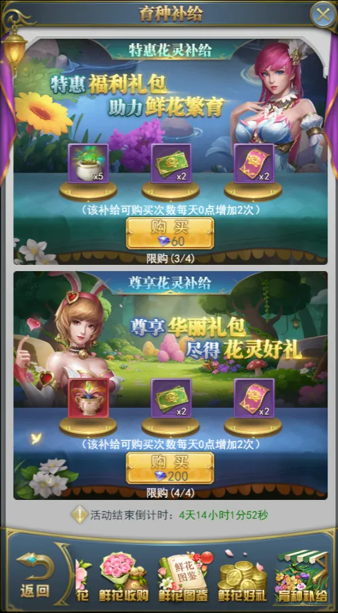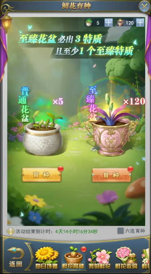 活动期间,可在育种补给中购买普通花盆、至臻花盆、育种许可证、收购券!
