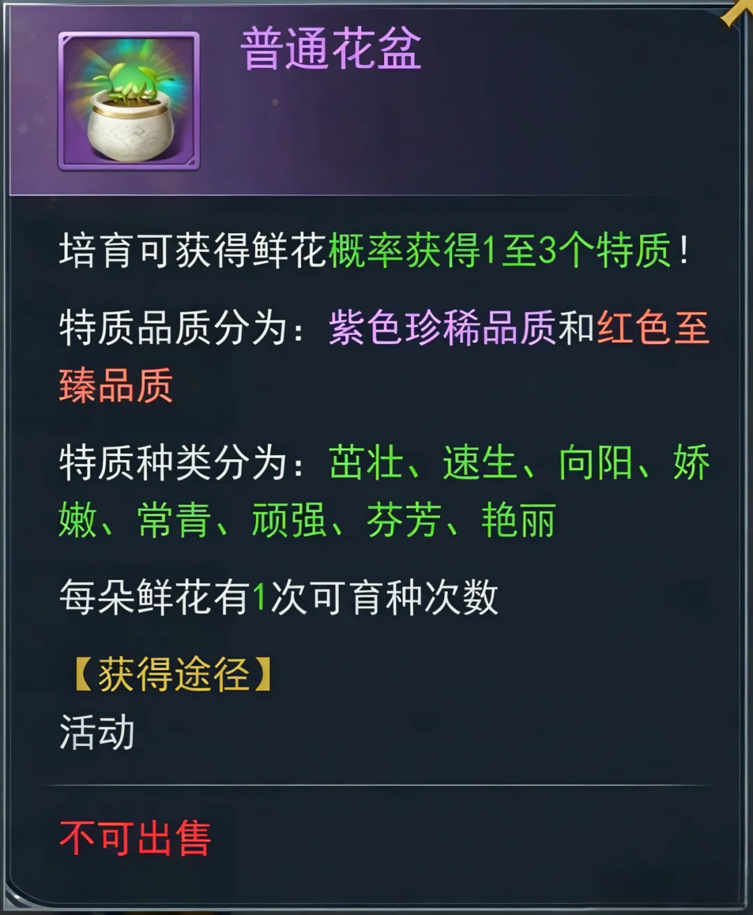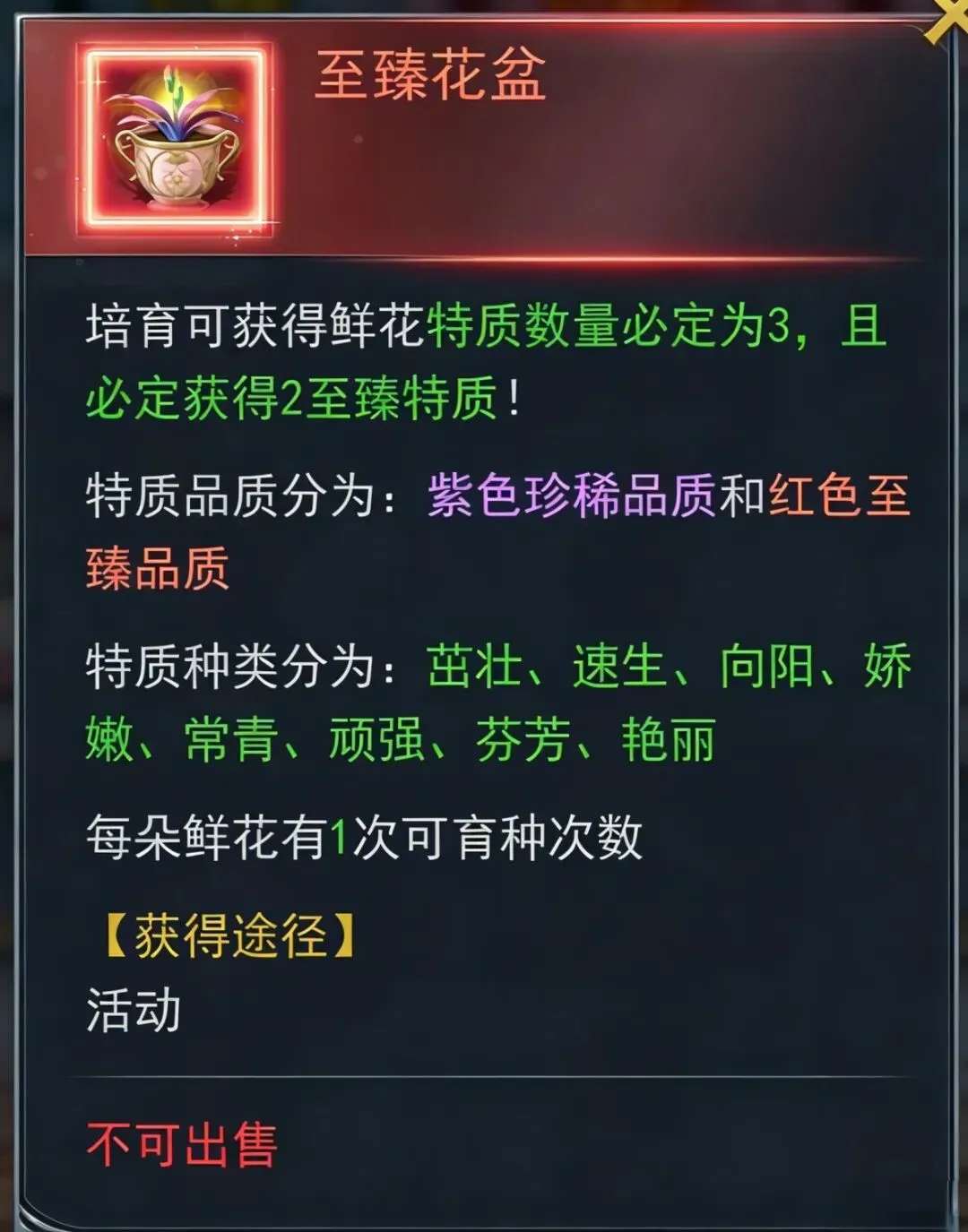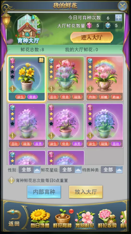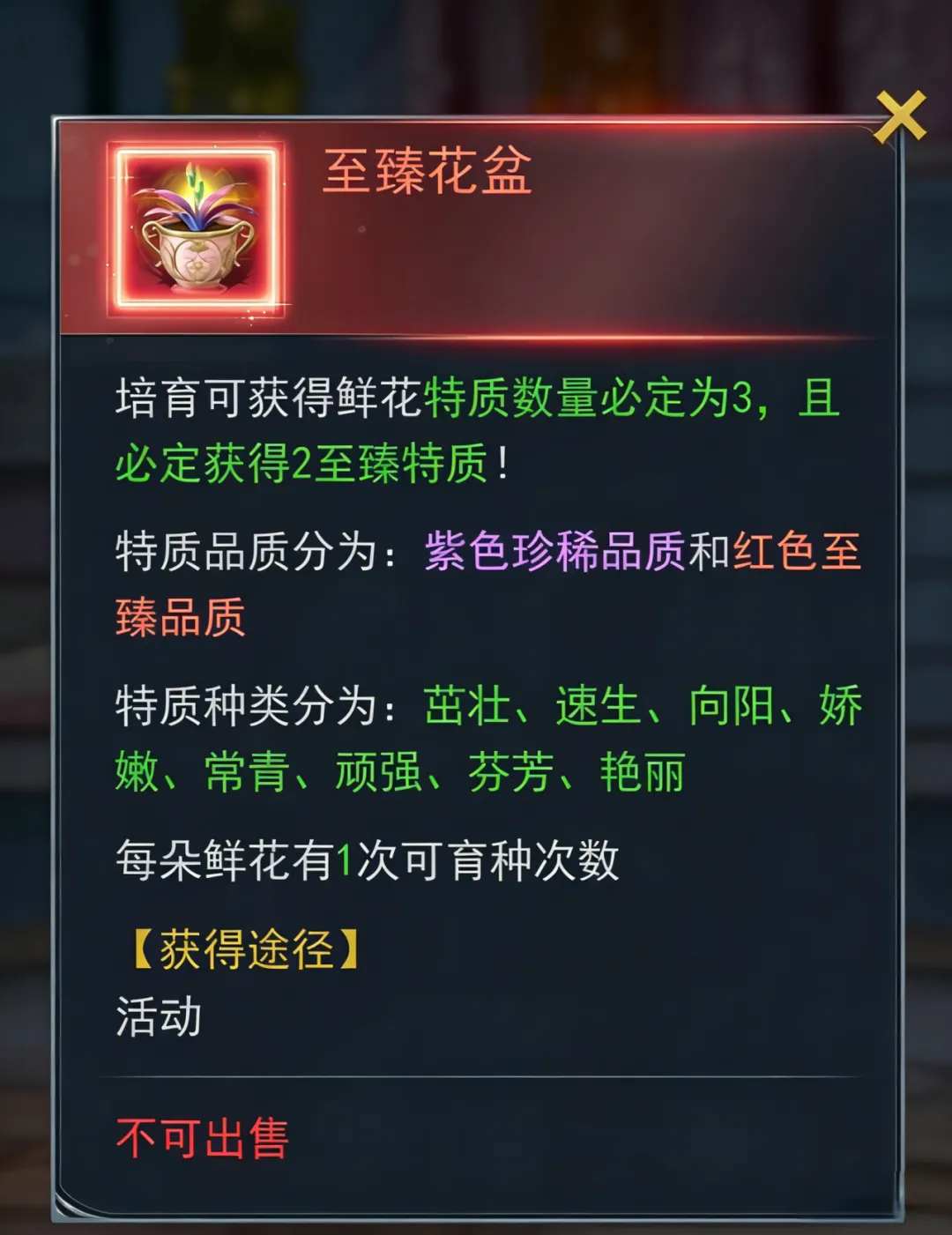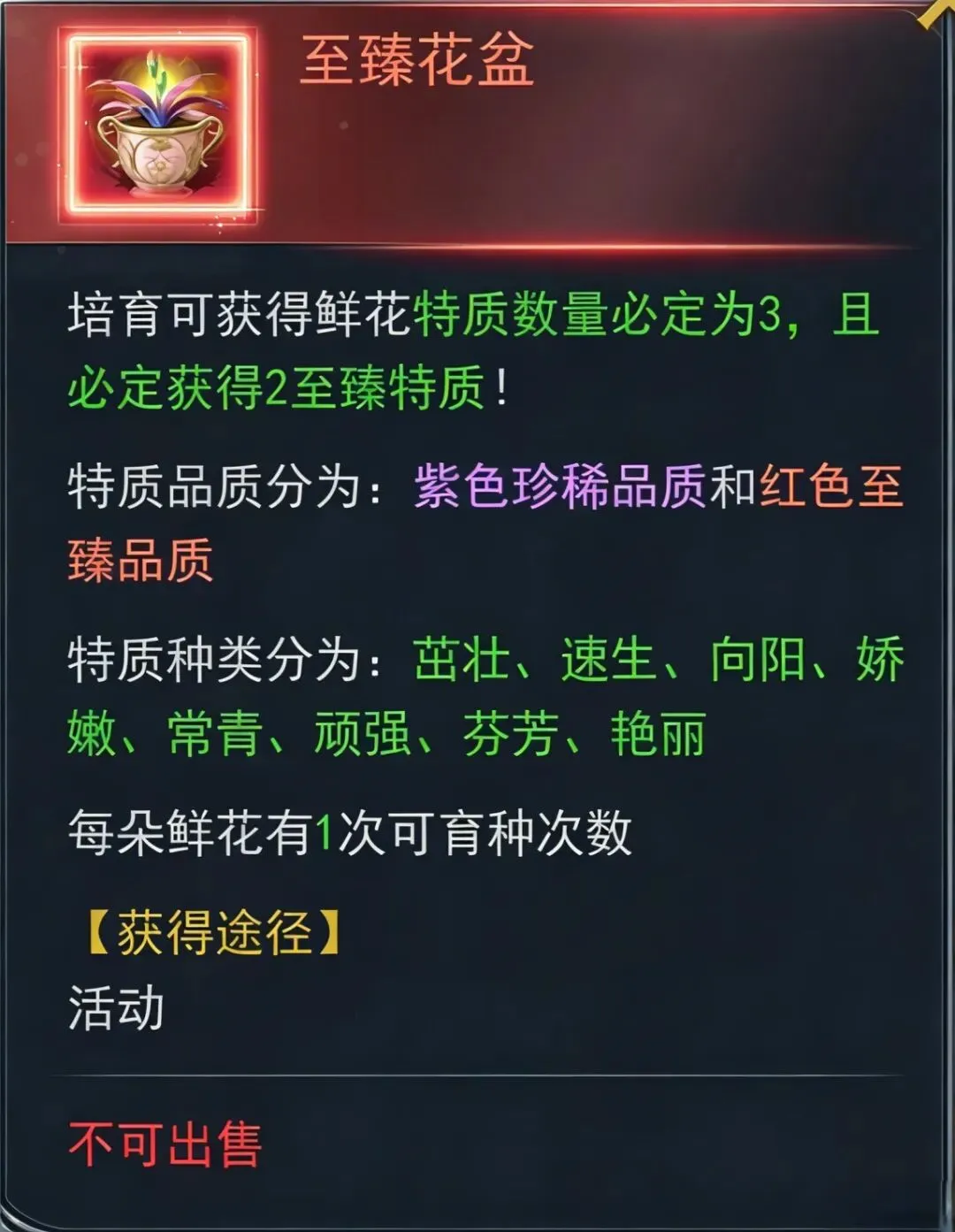 可消耗普通花盆或至臻花盆进行鲜花育种,普通花盆培育出的鲜花至少有1个特质,至多有3个特质;至臻花盆培育出的鲜花必有3个特质,且必定包含2个至臻特质。