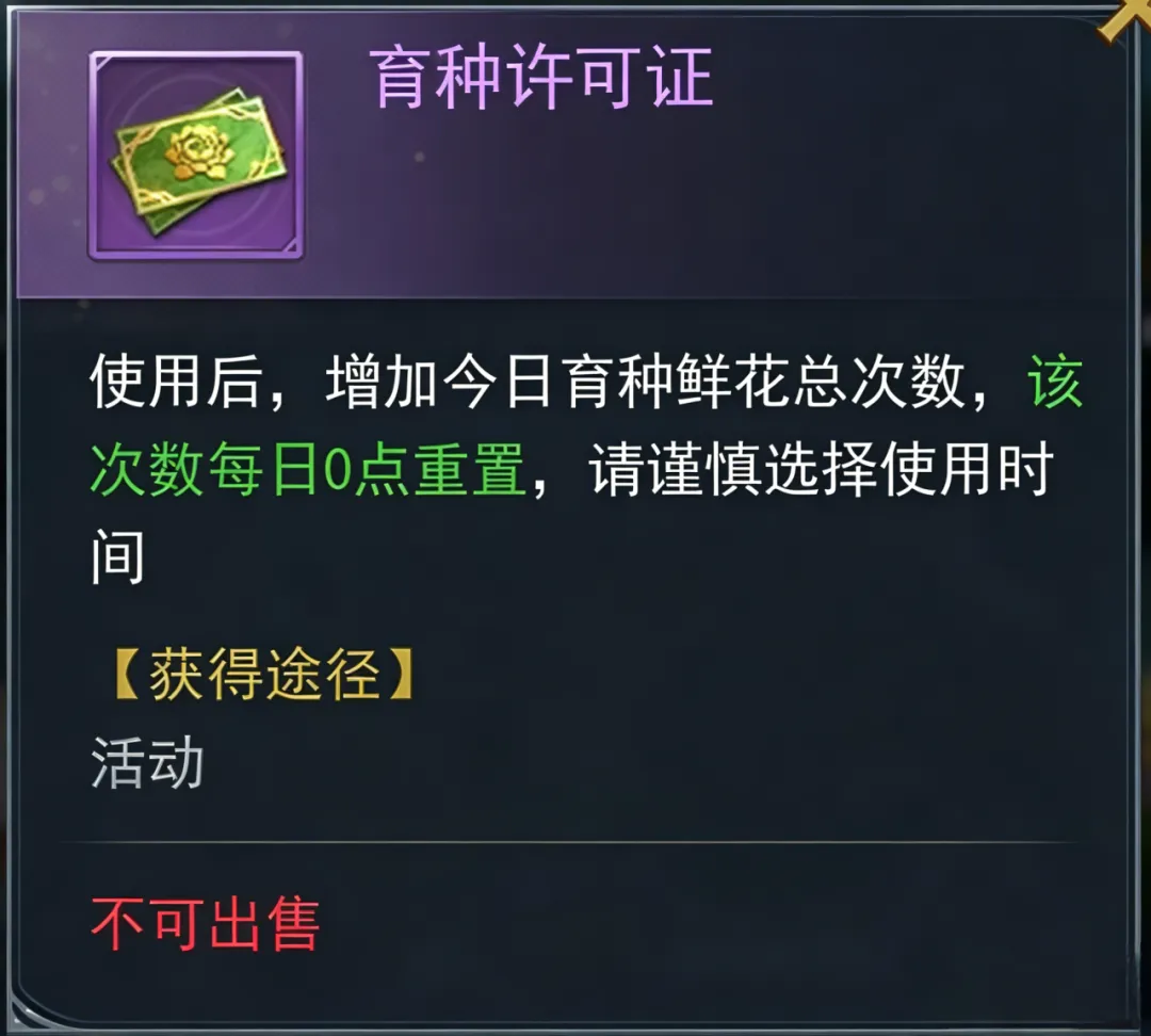 可使用育种许可证增加今日育种鲜花总次数,该次数每日0点重置,请谨慎选择使用时间