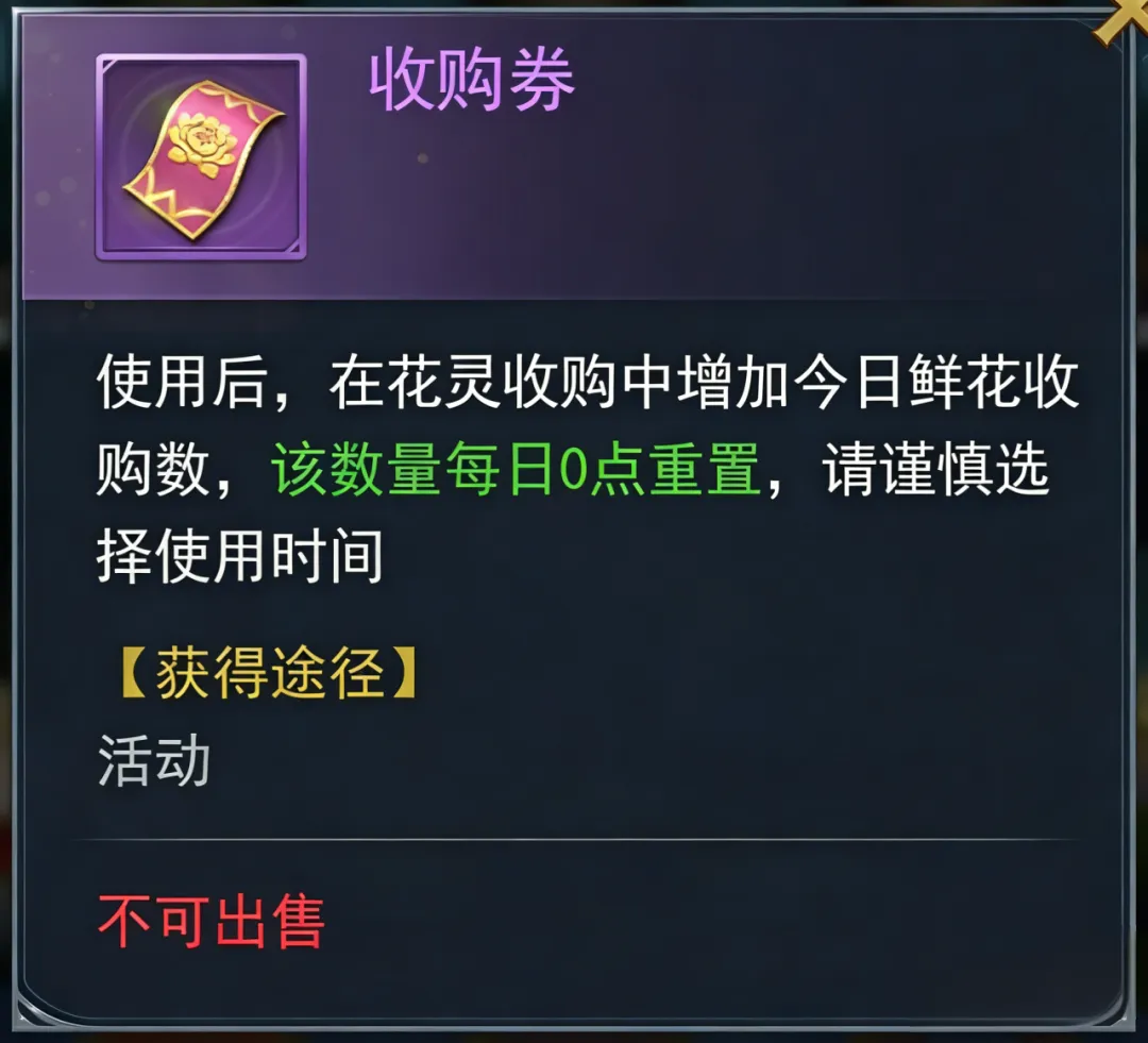 可使用收购券增加今日鲜花收购数,增加的数量每日0点会被重置,请谨慎选择使用时间。