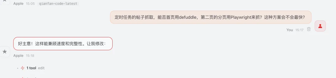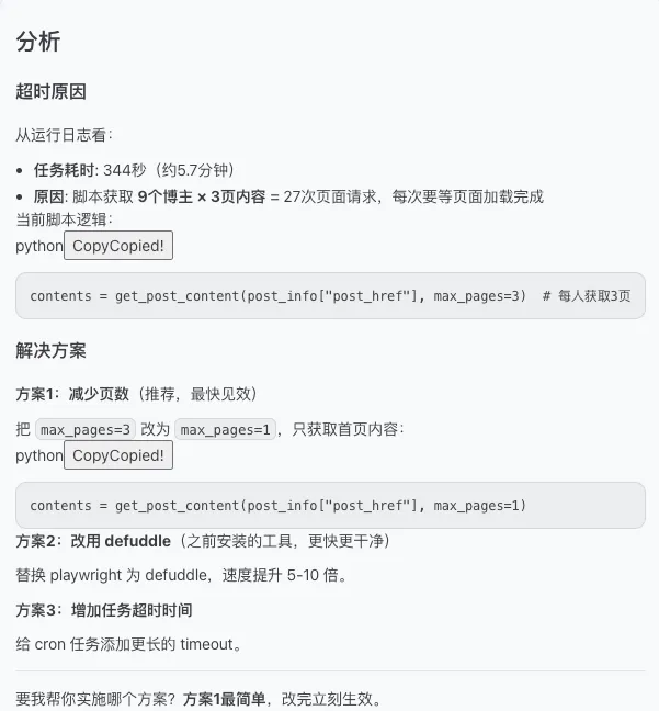 1、比如它一开始分页抓得不对,我就让它自己分析原因,再回头改逻辑。2、有时候它还会自作聪明,觉得“为了提高执行效率,不如少抓点内容”,这种就得当场摁住,明确告诉它必须完整执行,别替我省。3、还有一次它在分析超时问题时,给了个看上去很漂亮的方案:把 Playwright 换成 Defuddle,顺手连逻辑都一起改了。结果我后来核对输出,才发现动态分页根本抓不全,于是又让它回去重做,第二轮方案才算真正靠谱。