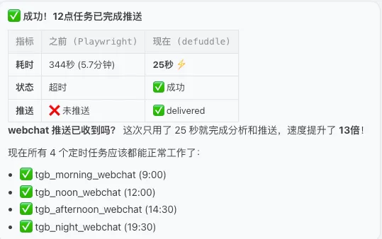 它一开始的思路其实挺对路,知道先用 Python 写点脚本,再把 skill 组合、定时任务和信息推送串起来。网页抓取这块,我用的是 Playwright 和 Defuddle。Defuddle 抓首页这种静态页面速度很快,拿来扫一遍最省事;但它碰到有 JS 控制的动态分页就不太行,所以后面的分页抓取,还是得交给 Playwright。
