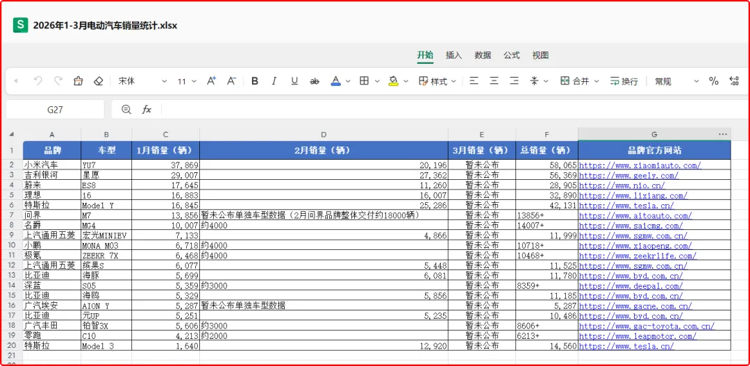 帮我统计2026年1月至3月电动汽车的月销售数据,并汇总生成一份Excel表格,要求表格包含:品牌,车型,1月、2月、3月的月销售量,总销量,对应品牌汽车的官方网站。