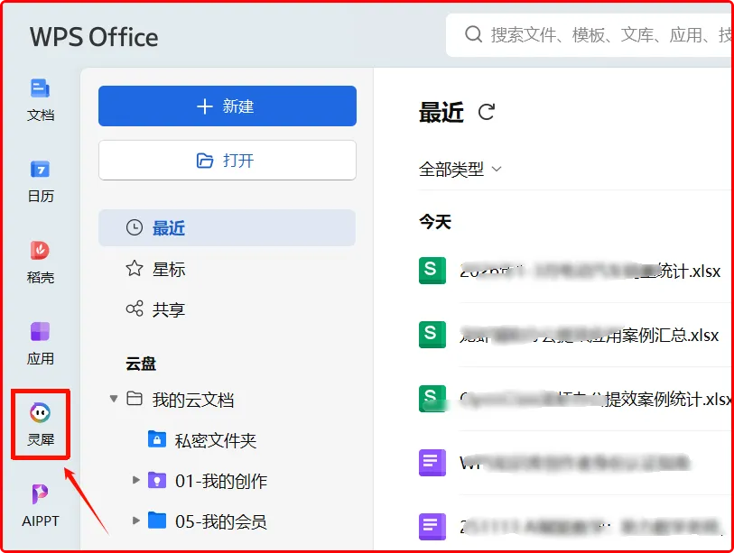 打开WPS AI版,在左侧边栏,可以看到有灵犀的快捷图标