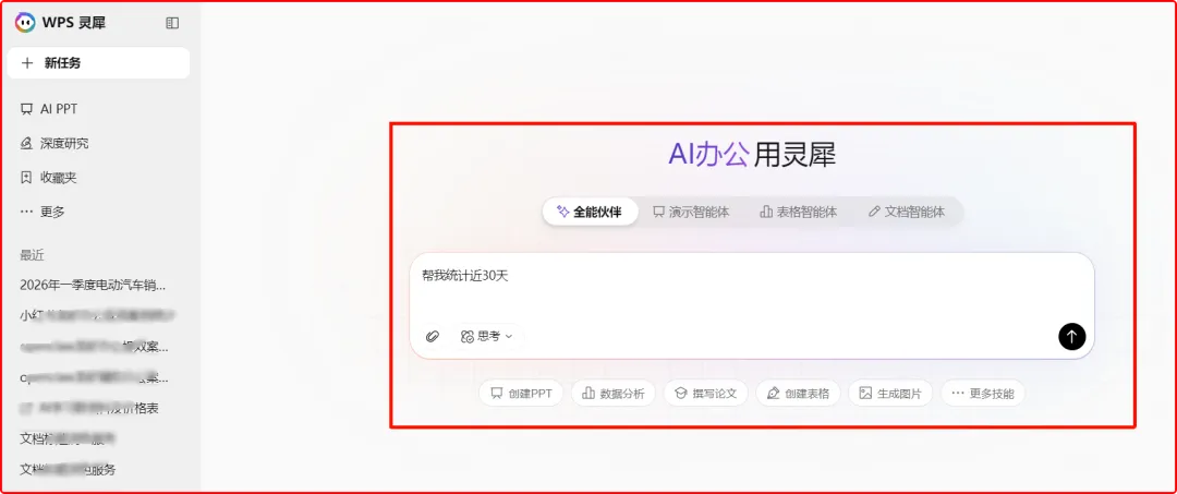 唤起WPS灵犀后,可以看到,新升级后的WPS灵犀,推出了演示智能体,表格智能体,文档智能体等,多种智能体的模式。