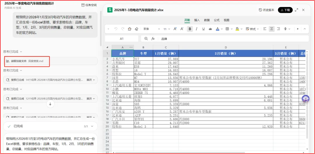 这里,我在任务指令中,要求了要带上品牌汽车的网址,结果,AI在生成表格中,还真给实现了。