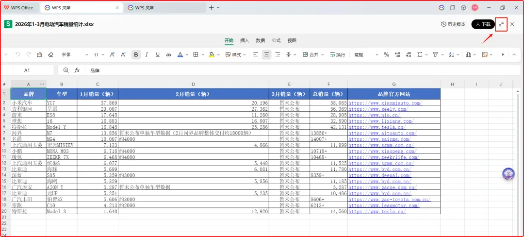 比如,这是我用新升级后的WPS灵犀,一键汇总,自动统计和制作出的电动汽车今年的销售情况数据。