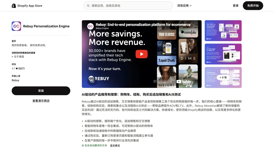 Rebuy 是目前名气最大的,因为它管得宽。从客户进站、加购、结账,到付完款后的 Thank-you 页面,它都能冒出来推销。