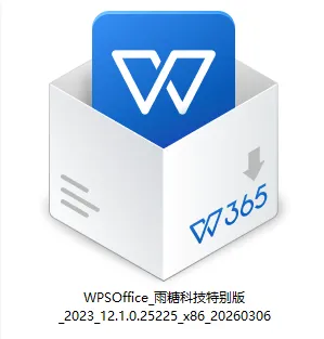 2、2023 v12.1.0.25222 雨糖科技 12.1.0.25222 20260302 stage1 特别版WPS文字新增“中文拼写检查”功能,WPS公共支持字体和字号实时预览,云服务选项卡下,新增“发送至手机”入口,方便PC和移动设备间互传文件。WPS文字隐藏页间空白。单击显示/隐藏页间空白,改成双击显示/隐藏页间空白,减少用户误操作的可能。WPS表格数字格式支持设置万元、正负号格式,支持对单元格前后有空字符串进行检查,当冻结线在视图区域以外,滚动视图区域弹出提示信息。支持设置包含通配符、空格的搜索条件。WPS演示修复浏览视图,显示比例无法设置超过100%的问题。修复审阅选项卡中的“删除批注”按钮tooltip文本显示不正确的问题。免激活、去水印、永久授权、完整功能优化增强。基于官方WPS2023专业版打包,自动调用安装脚本写入终身授权序列号。序列号采用博湖县政府专用版: TJ3GN-9NTGQ-GLF7C-YEN8X-TJWML。集成VBA组件、终身授权序列号、安装完毕即WPS永久激活专业增强版。去广告优化、去我的电脑WPS云盘、保留账户登陆和云同步上传下载。去界面左侧:日历、WPS便签、会议、统计表单 (广告)。去应用中心:分享协作功能网页入口(会议、统计表单)。彻底去升级:无版本更新提示,检查更新永远都是最新版。安装过程自动剔除桌面和我的电脑WPS云盘虚拟盘符入口。 安装过程自动禁用WPS办公助手和其资源管理器右键菜单。安装过程自动删除升级组件并移除检查升级的计划任务项。 安装过程自动清理旧授权文件并阻止检测新授权文件验证。修复离线模式下工具栏保存按钮消失的问题。修复 PDF 组件文件菜单中分享选项异常消失又出现,导致整个菜单抖动的问题。新增发票查验与打印功能(仅在线模式,发票查验需要开通会员)。文印模式支持增强。进一步完善程序配置。修复离线模式下工具栏保存按钮消失的问题;修复安装体验的问题。修复 PDF 组件文件菜单中分享选项异常消失又出现,导致整个菜单抖动的问题。新增发票查验与打印功能(仅在线模式,发票查验需要开通会员)。文印模式支持增强。进一步完善程序配置。版本号以 12.8 开头的为2023商业版(企业版、365),版本号以 12.1 开头的为2023个人版(免费)。下载软件安装包后先解压,然后以管理员身份运行“WPSOfficePro_12.1.0.23542_mefcl_VB7.exe”,按照提示步骤进行安装即可。全部安装好了桌面上会出现下面四个图标,随便打开其中一个工具。即可无障碍使用。