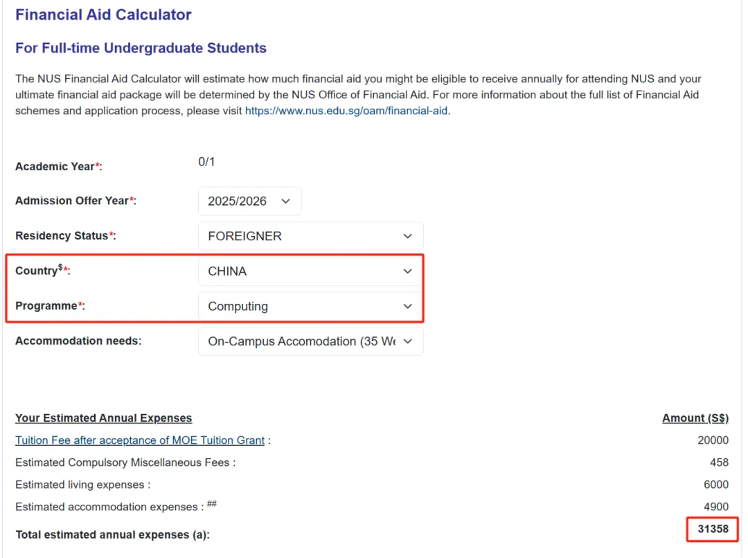入读NUS计算机专业的中国学生每年需要支付的总费用(含学费及生活费)金额为31,358新币(约16.9万元人民币),其中: