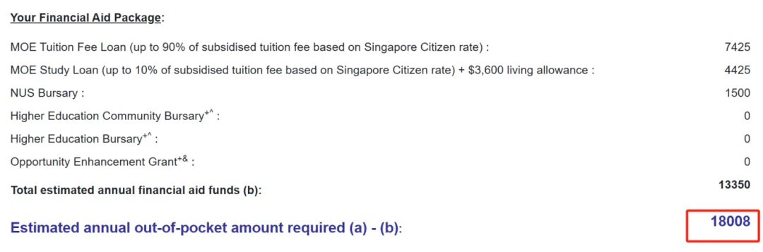 而申请新加坡教育部&NUS提供的助学金后,预计每年自费(含学费及生活费)金额仅为18,008新币(约9.7万元人民币)。