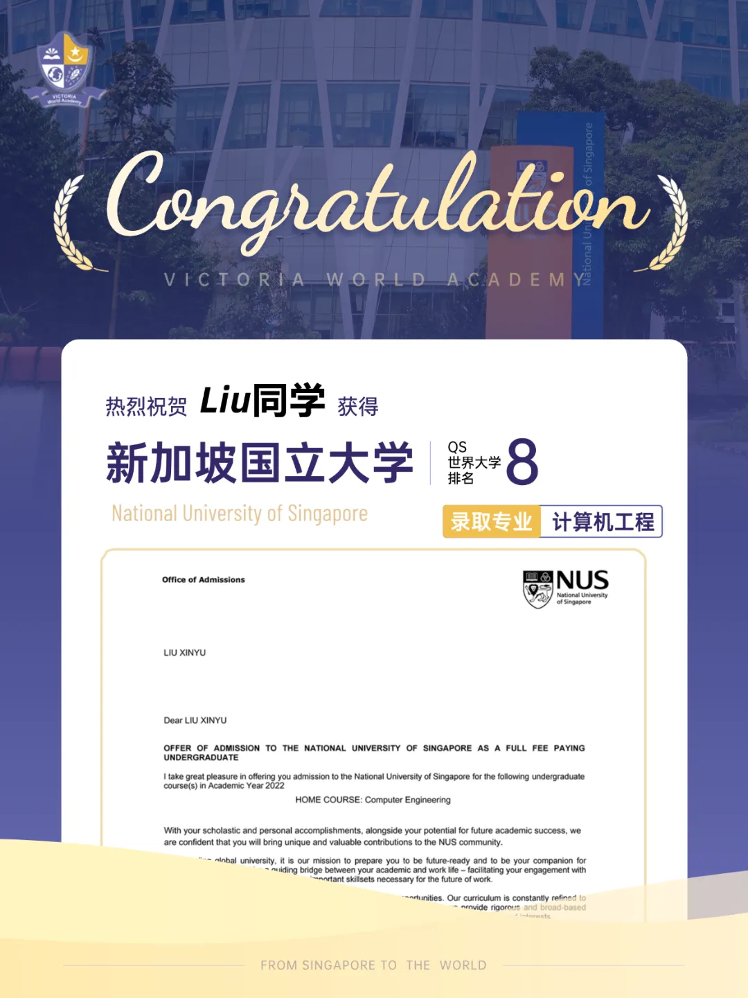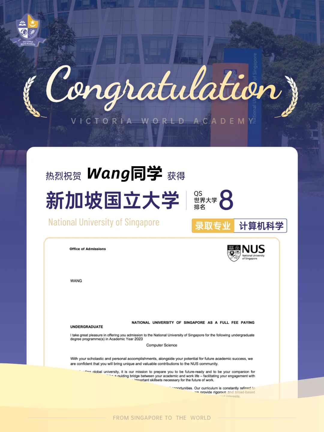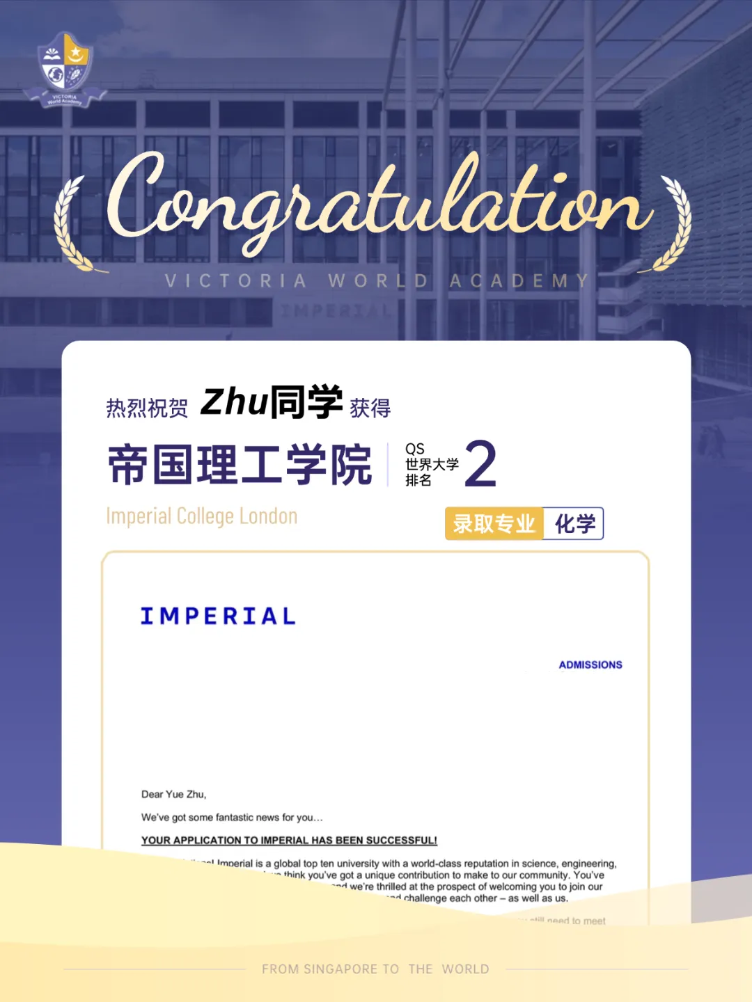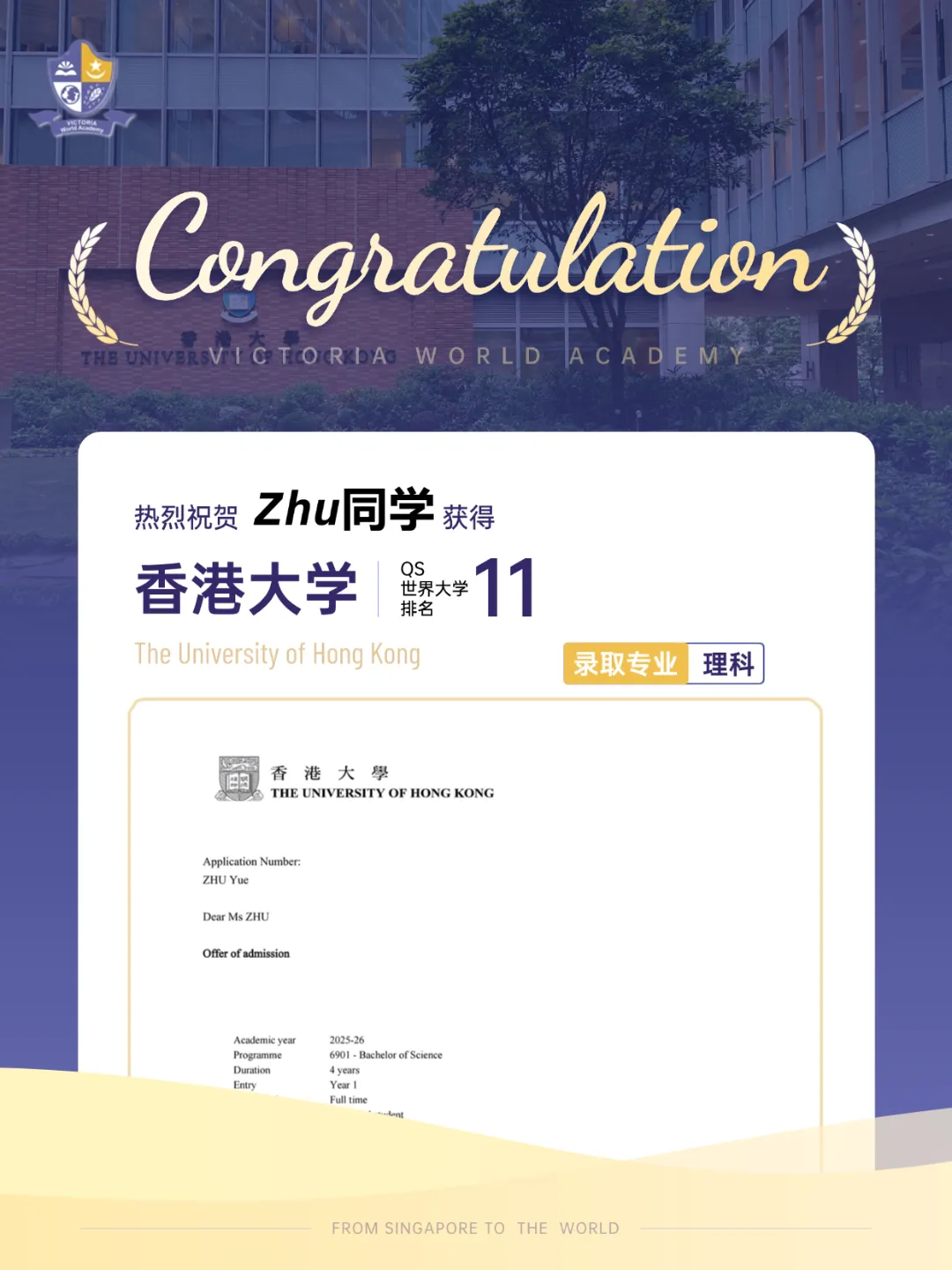 近年来,维多利亚世界学院学子已收获7封新加坡国立大学、南洋理工大学录取通知书,并收获帝国理工学院、伦敦大学学院、香港大学、香港科技大学、墨尔本大学等世界顶尖名校offer。