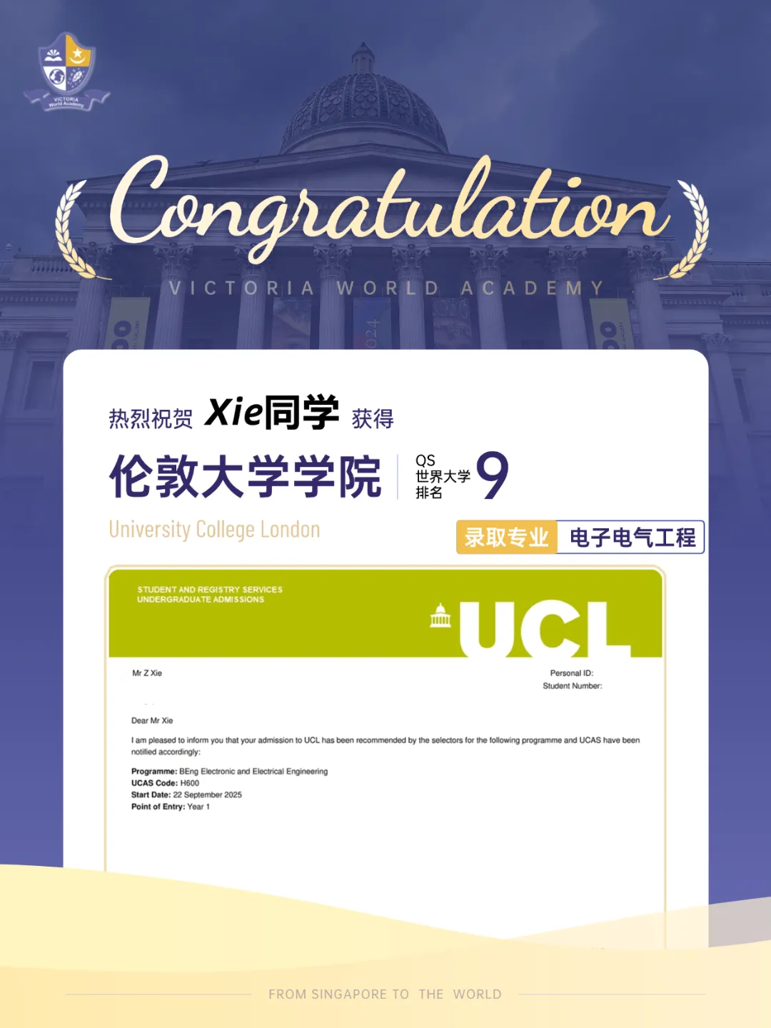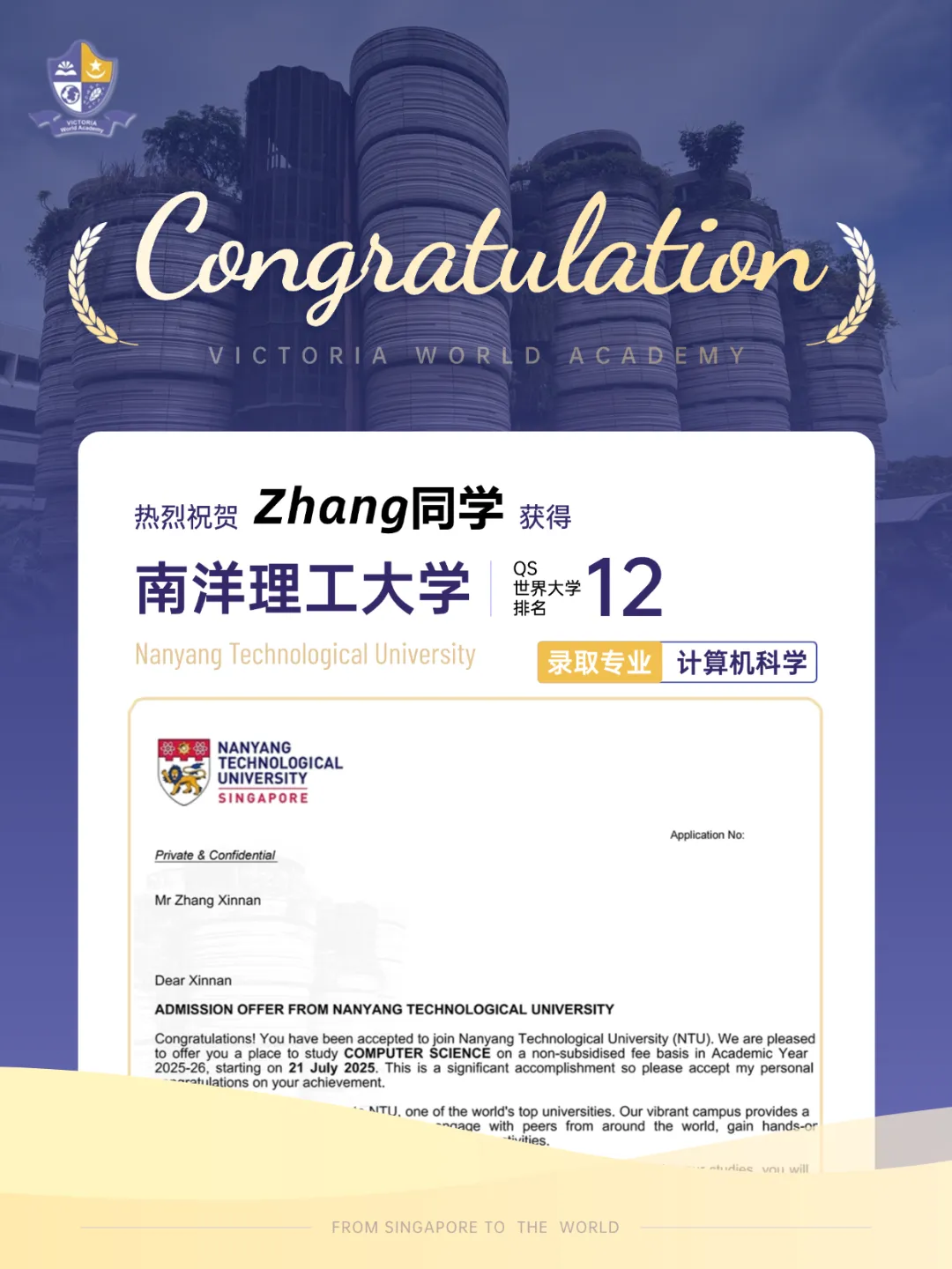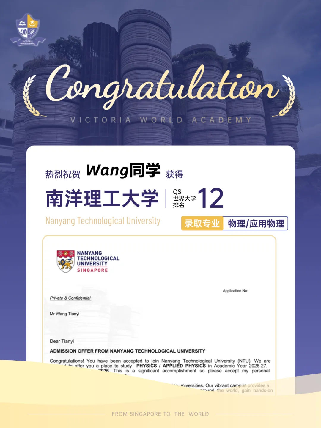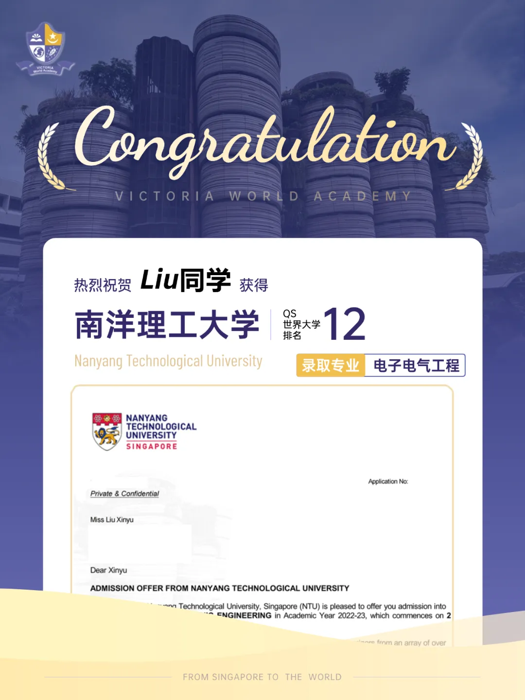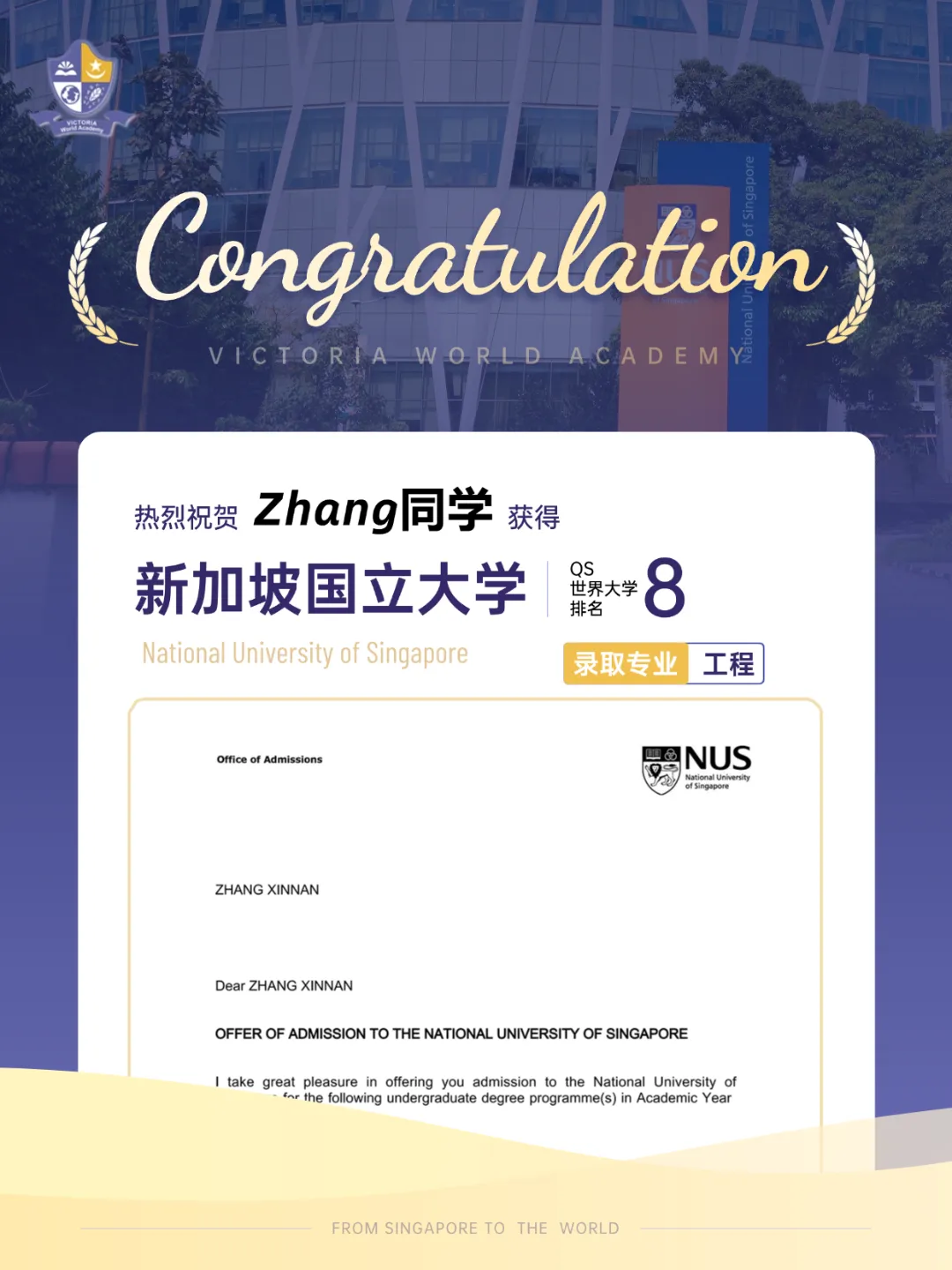 近年来,维多利亚世界学院学子已收获7封新加坡国立大学、南洋理工大学录取通知书,并收获帝国理工学院、伦敦大学学院、香港大学、香港科技大学、墨尔本大学等世界顶尖名校offer。