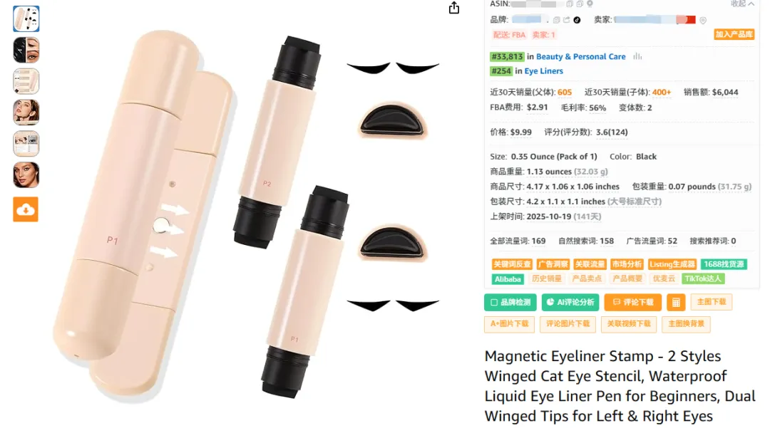 这款眼线印章笔适合做美妆类目的卖家,有需求但需把控品控。值得做的是切中懒人痛点,自然流量表现好,没有外观专利风险;但产品评分只有 3.6 分,口碑一般,类目卖家集中度高达 90.1%,头部竞争激烈,得靠品控和教程类内容营销突围,还要做好合规认证,避免出现安全问题。