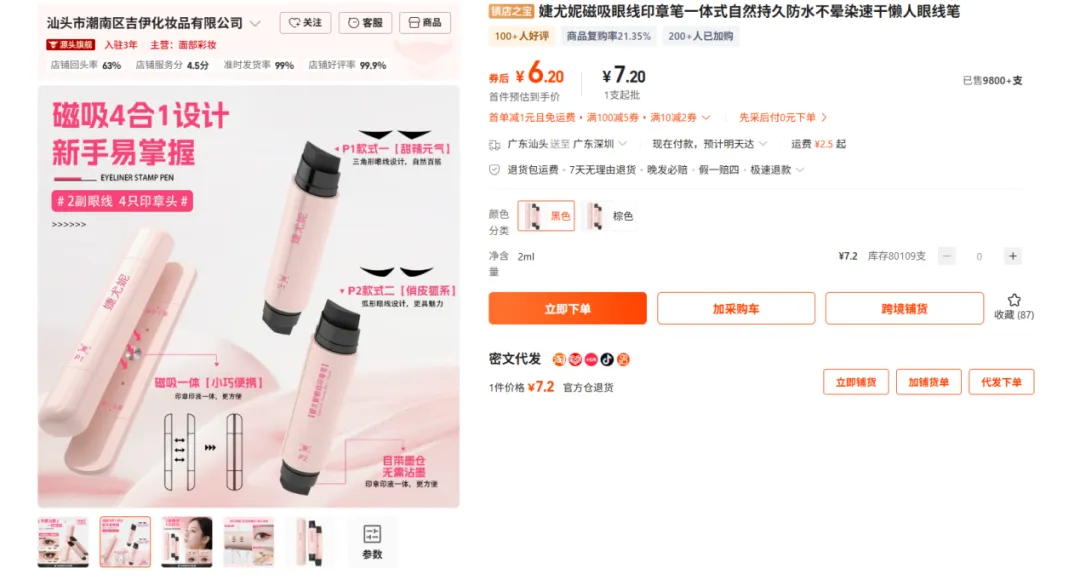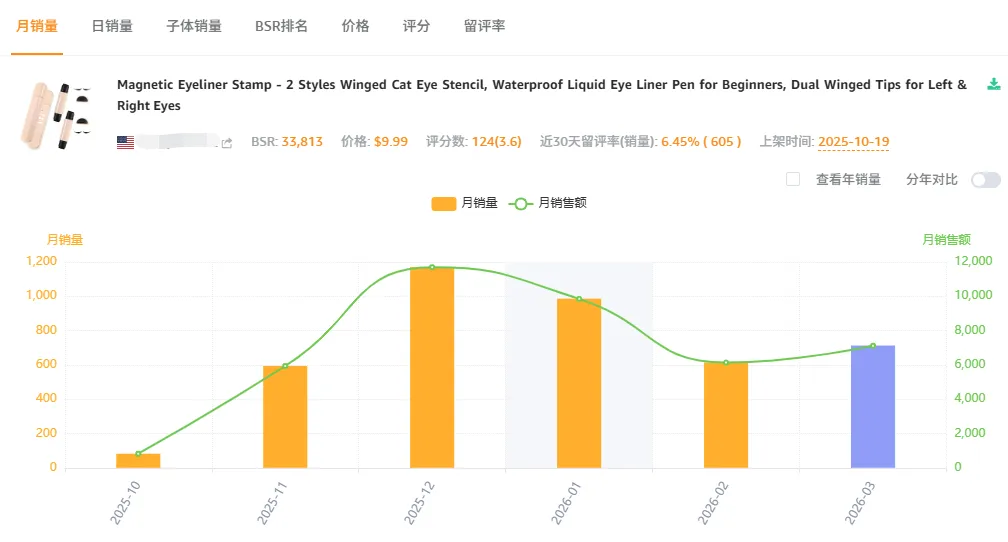 不会画眼线的新手大概率会被这款印章笔吸引,双头设计 + 磁性吸附,主打 “新手也能画好眼线”,上架 4 个多月月销 600 多单,47% 的毛利率不算低。美妆赛道需求稳定,就是不知道产品效果和类目竞争能不能扛住?