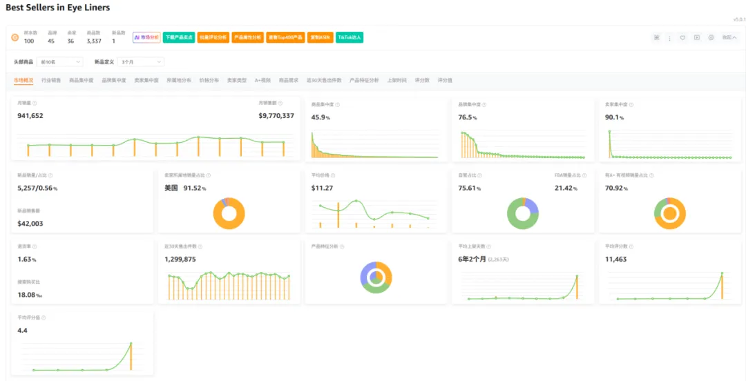 市场数据显示,100样本中新品有1个,新品销量占比0.56%,商品集中率45.9%,品牌集中度76.5%,卖家集中度90.1%,美国卖家占比91.52%,类目退货率1.63%。