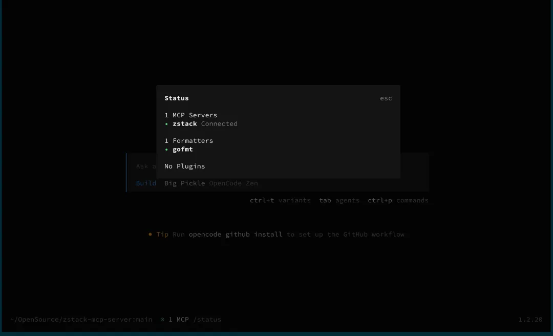 看到 MCP server 状态变成 ✓ zstack connected,就可以开始了。
