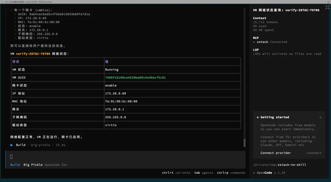 | OpenCode + DeepSeek + ZStack MCP | ~¥0.05 | 全免费 | 日常运维,成本敏感 |