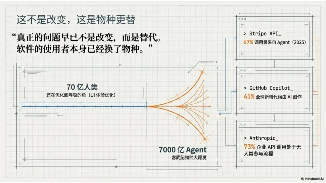 今天的转折点比以往任何一次都更加剧烈。因为这一次,改变的不是工具,不是平台,而是使用者本身。当软件的用户从人变成 Agent,当 70 亿人类用户变成 7000 亿个 Agent——这不是技术升级,这是物种更替。