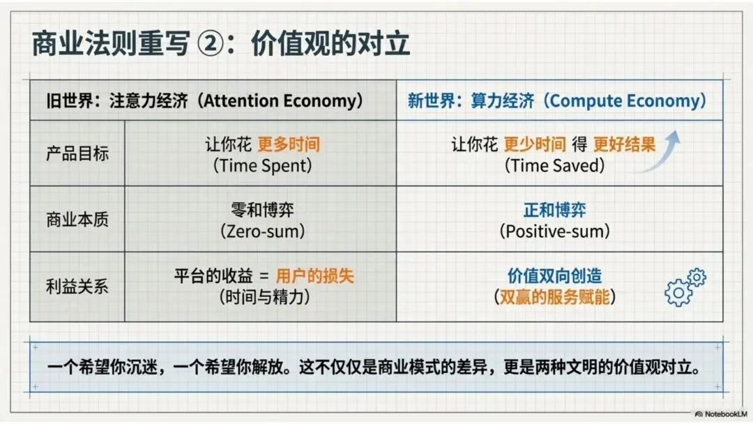 当你付费让 Claude 帮你写代码、让 Midjourney 生成设计稿、让 AI Agent 处理客服工作时,发生的是价值的双向创造:你得到了成果,AI 公司得到了收入。没有人的时间被浪费,没有人的注意力被劫持。