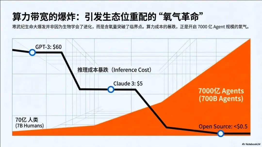 就像寒武纪大爆发,不是因为生物突然学会了进化,而是因为大气含氧量突破了临界点。算力成本的暴跌,就是 Agent 时代的“氧气革命”。