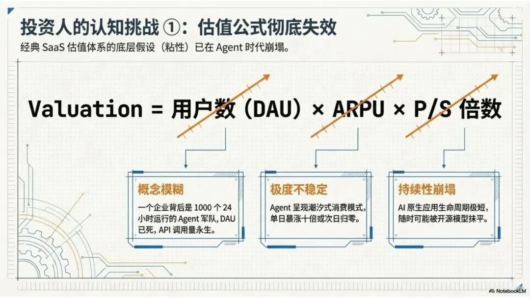 “你说的这些我都同意——Agent 是新物种,DAU 已死,API 调用量永生。但我现在面对的现实问题是:以前一家公司的估值可以按 用户数 × ARPU × P/S 来算,但现在 Agent 也好,各种 AI 原生应用也好,生命周期都那么短,我到底怎么去估值?”