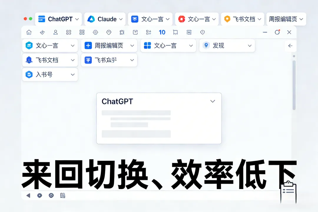 你在 ChatGPT 里问了一个技术问题,得到的答案需要稍作修改才能用。你把代码复制到 Claude 里让它优化,再把结果粘贴到飞书文档里。下午开会前,你想起还要用 ChatGPT 写个周报,又在另一个标签页里重新输入提示词。