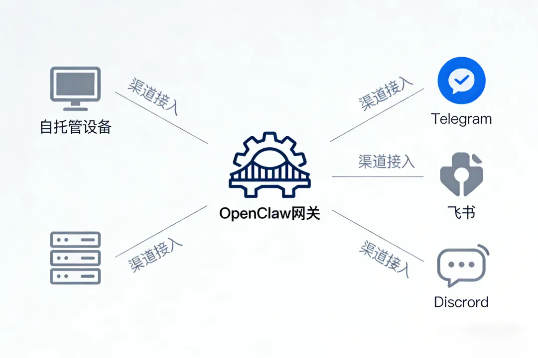 OpenClaw 就是这样一个”自托管 AI 网关”。它把 AI 能力装进你自己的设备里,再通过你熟悉的聊天工具(Telegram、飞书、Discord 等)与你交互。